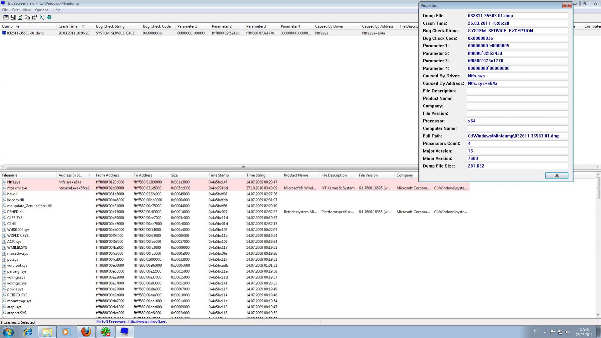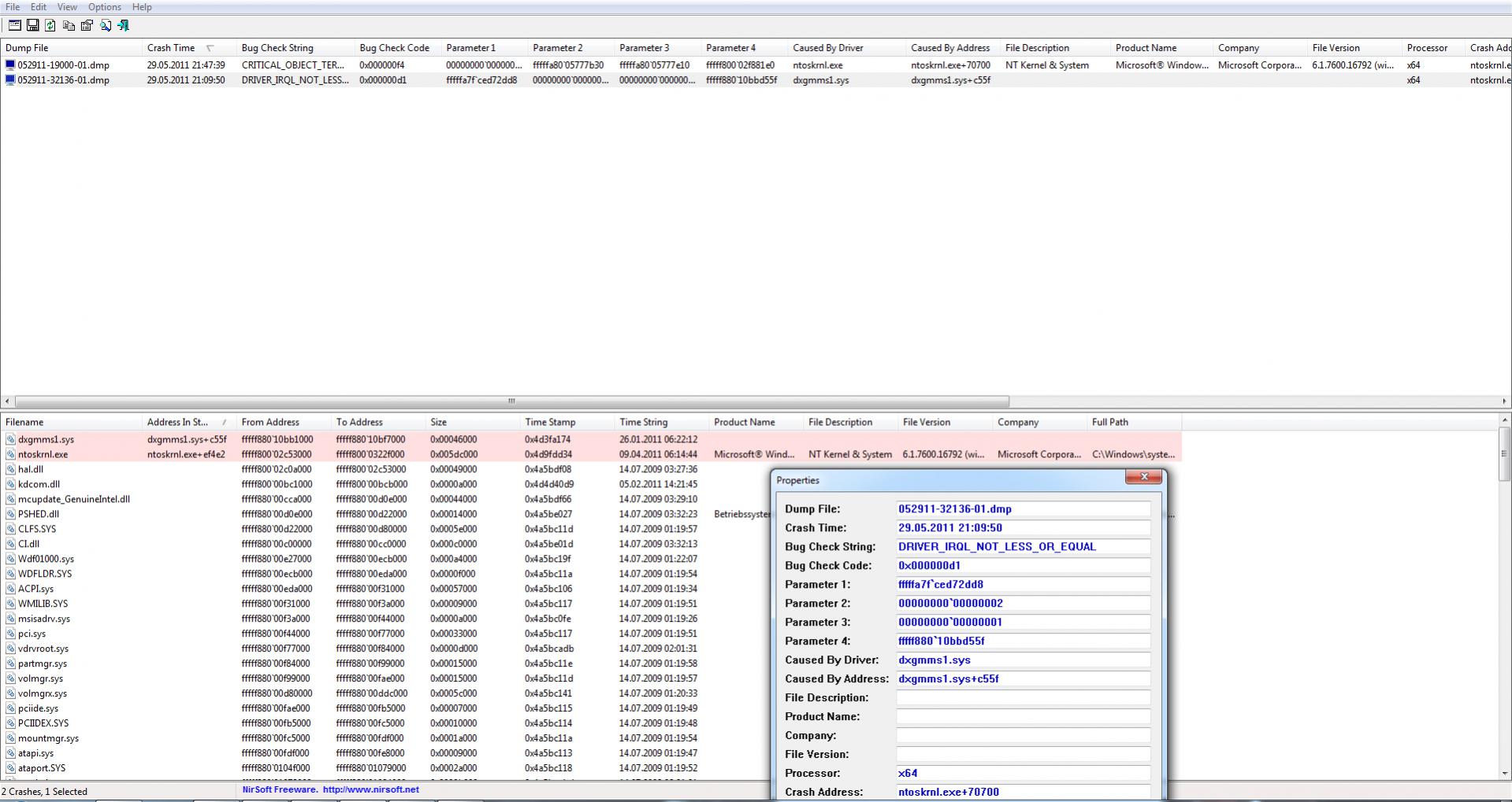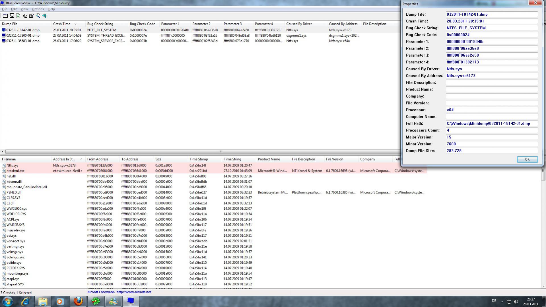 Die meisten Bluescreens (alle mitgezählt) wurden von ntoskrnl.exe verursacht.
