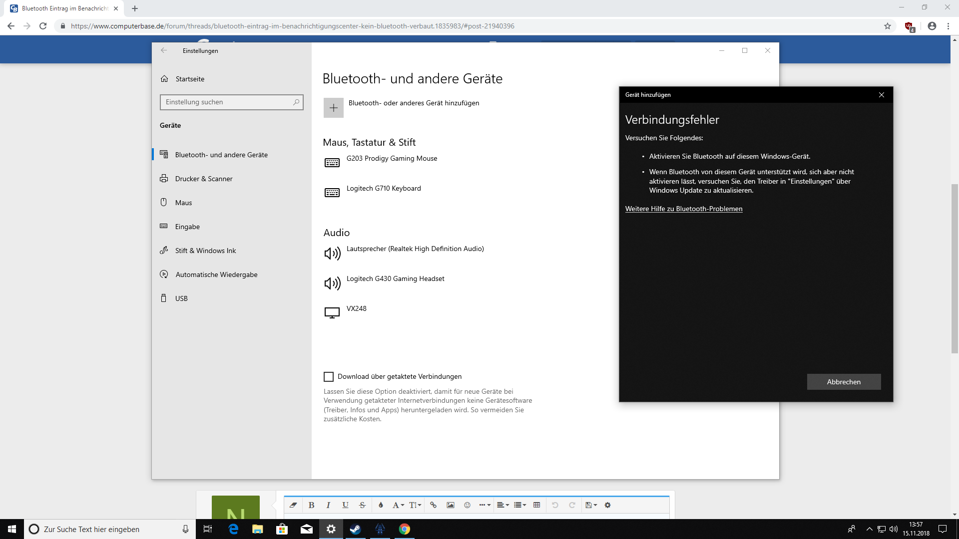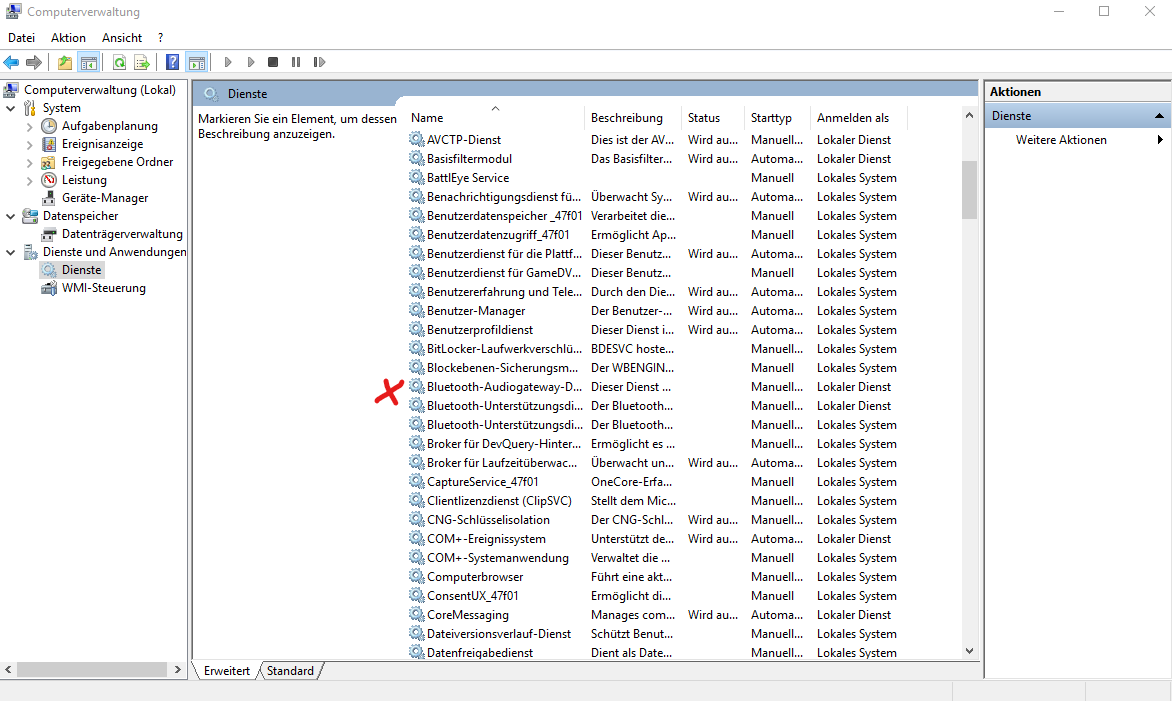 Auf dem angehängten Bild habe ich im Benachrichtigungscenter ein rotes Kreuz gesetzt. An dieser Stelle taucht manchmal der Eintrag für Bluetooth auf. So frei nach dem Motto "möchten Sie es ein oder aus schalten?". Zu meiner Verwunderung ist in meinem Desktop PC kein Bluetooth Sender oder Empfänger verbaut.