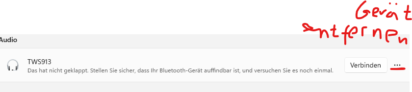 Ich hole die Kopfhörer aus dem kleinen "Gerät" raus, in dem sich die Kopfhörer befinden, dann wird auch "Connectet" gesagt. Dann gehe ich über meinen Laptop auf "Bluetooth und Geräte" und gehe dann so wie ich es bisher immer gemacht habe auf "TWS913". Unter "TWS913" steht "Gekoppelt" und wenn ich dann auf "Verbinden" gehe, erscheint unten "Das hat nicht geklappt. Stellen Sie sicher, dass Ihr Bluetooth Gerät auffindbar ist"