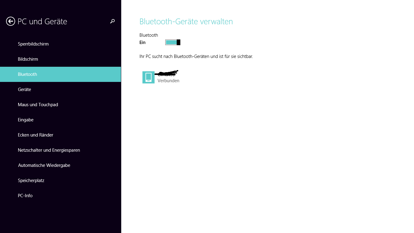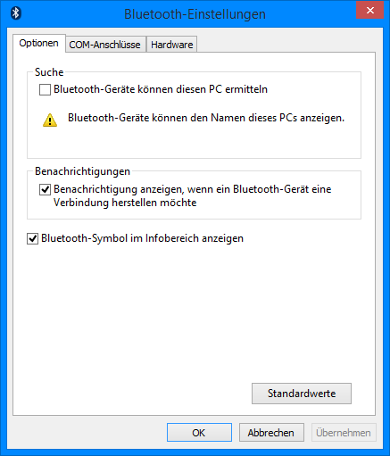 Unter Windows 8 ist diese Option nutzlos, auch wenn ich den Haken bei "Bluetooth-Geräte können den PC ermitteln" herausnehme, ändert sich nichts. (Bitte auf den Screenshot achten) Jedes andere BT-Gerät kann mein Notebook finden.