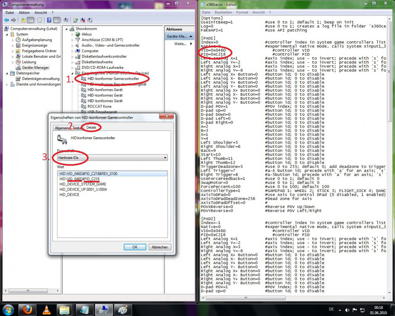 7. Tragt die Werte die ihr unter HardwareID findet wie im Bild in die x360ce.ini ein. Die 0x