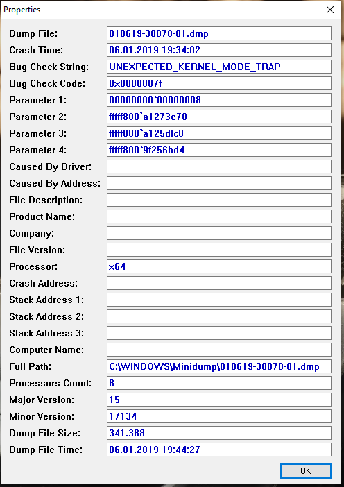 <Data Name="param1">0x0000007f (0x0000000000000008, 0xfffff800a1273e70, 0xfffff800a125dfc0, 0xfffff8009f256bd4)</Data>
