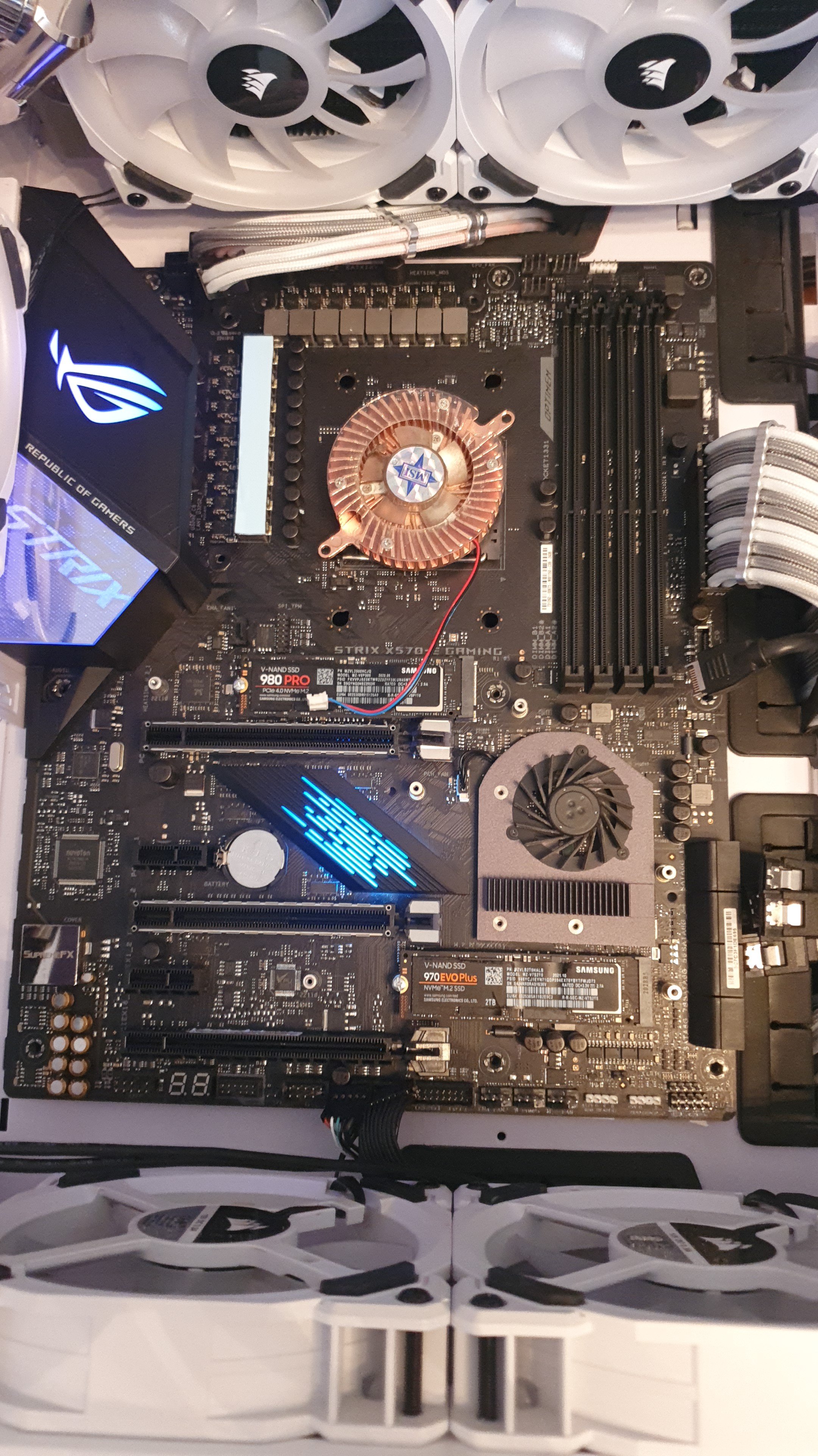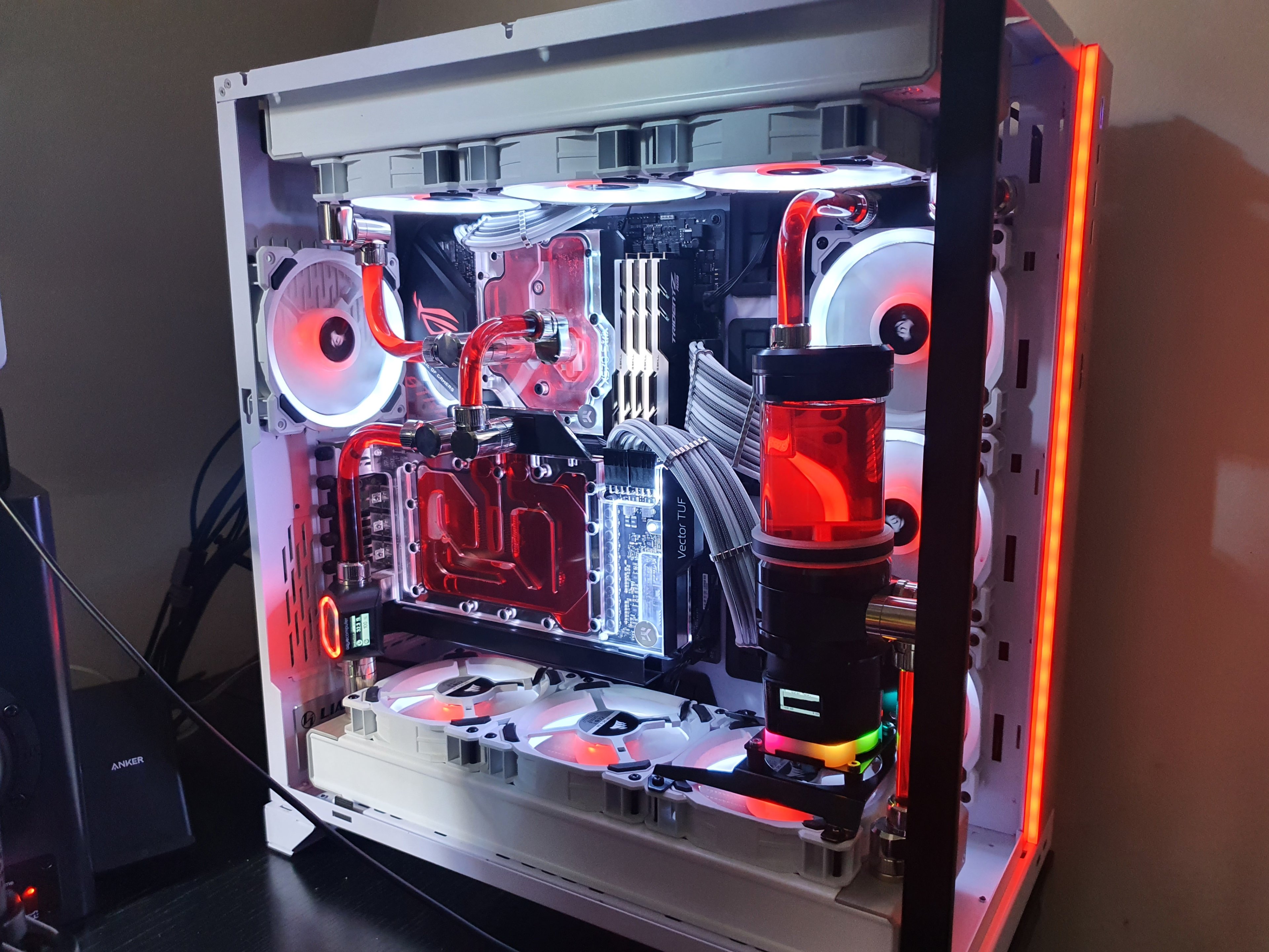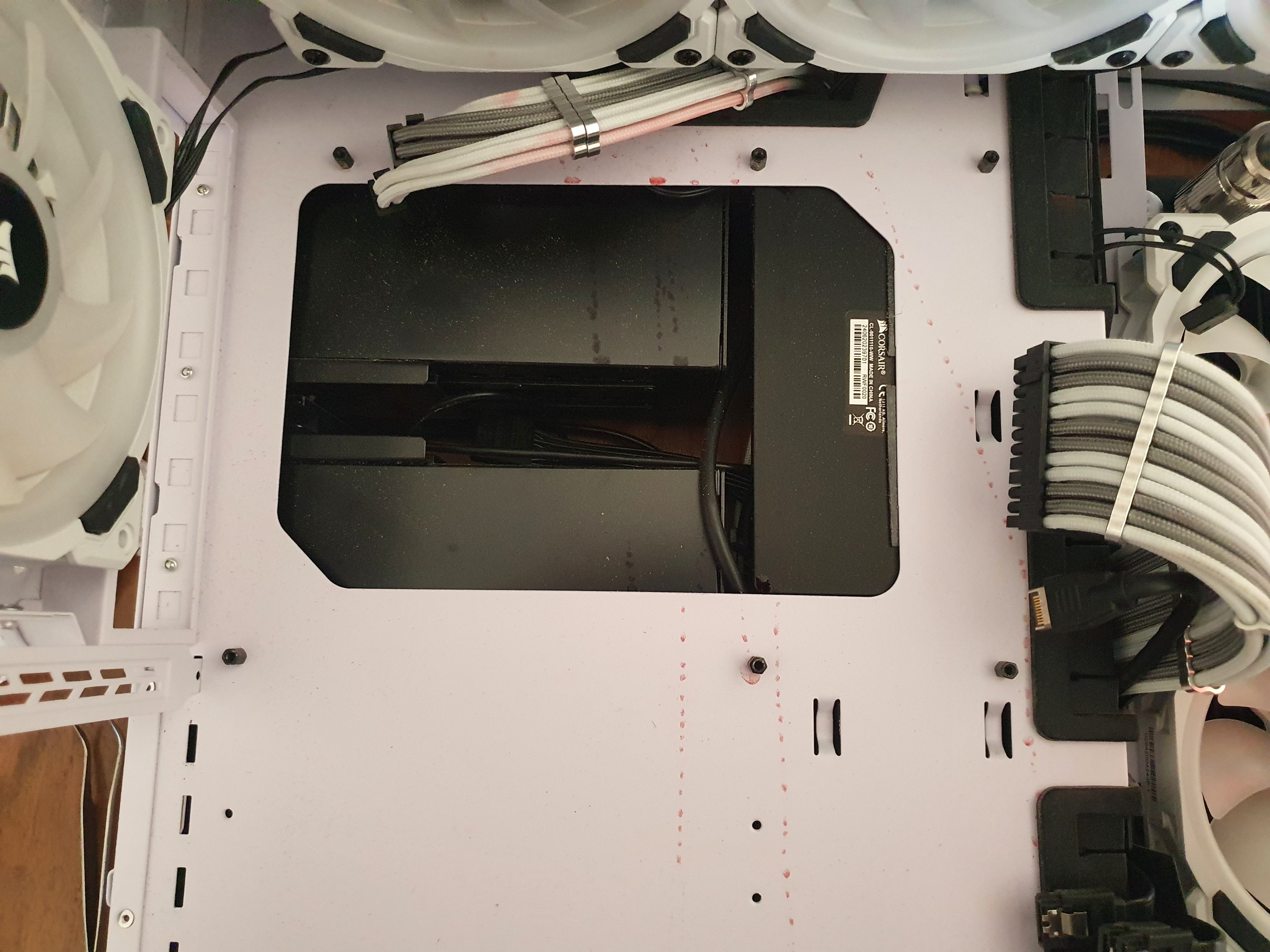 Also wieder alles zerlegen und nochmal gereinigt... warum auch immer, lief auf einmal aus dem CPU Block das restliche Kühlmittel raus. Der Kühler lag, flach aber aus irgendeinen Grund hat es das Kühlmittel raus gedrückt und ich habs zu spät gesehen und da lief es schon schön vom Monoblock aufs Board.... wieder alles zerlegt und gereinigt.