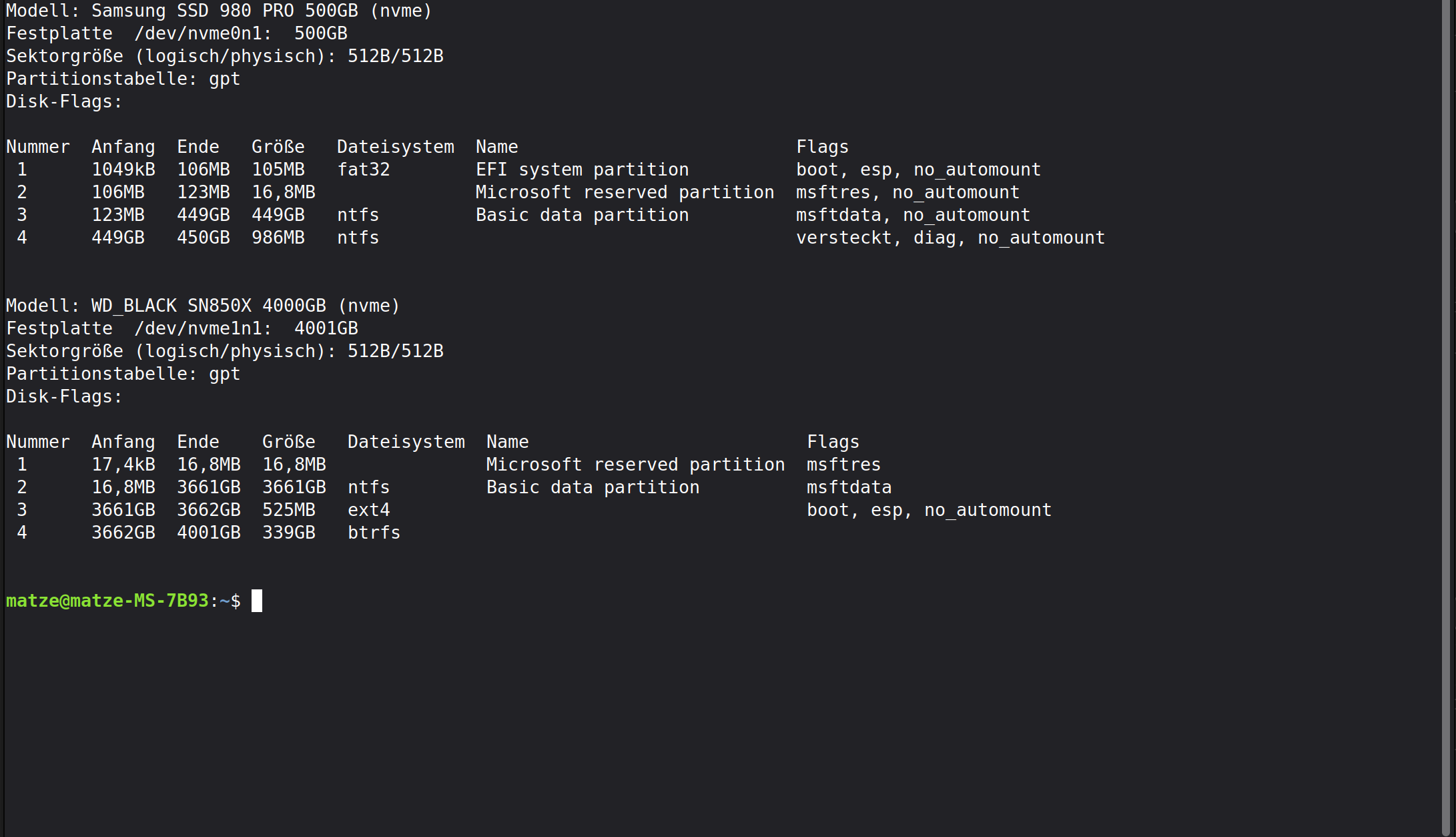 Es sind i.Ü. 2 ESP vorhanden! Mit obigem Befehl sieht man mit der UUID was welcher ESP zugeordnet ist. Wobei mich wundert, dass die ESP auf der dicken Platte ext4 ist und nicht fat32. Kenne ich so nicht!