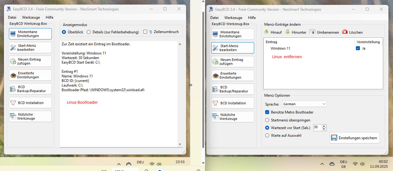 3) In Starteinstellungen Linux entfernen = rote Schrift.