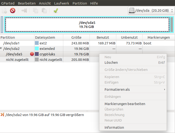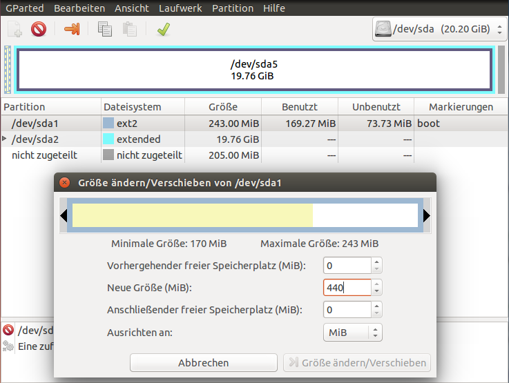 Ich habe versucht mit gparted als (Live-CD) dev/sda1 boot zu vergrößern, aber das war nicht möglich (s. Screenshot: man kann die Änderung nicht anwenden).
