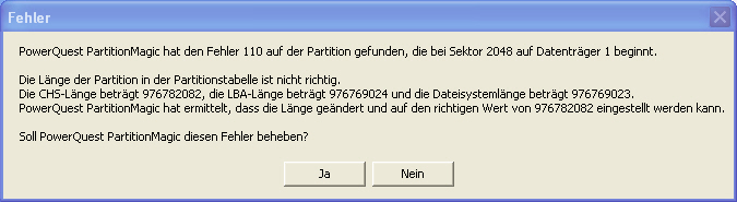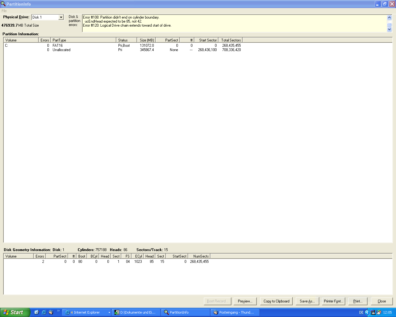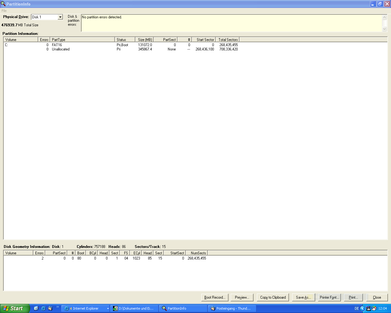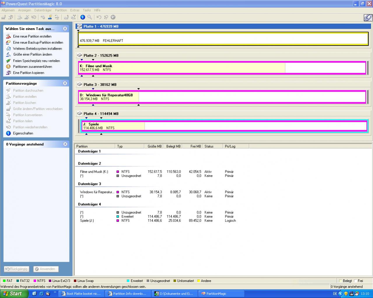 PM zeigt mir jetzt an, daß C:\ jetzt nur noch aus einer Partitionen besteht, und zwar nur 476 GB, die auch als Fehlerhaft angezeigt wird.