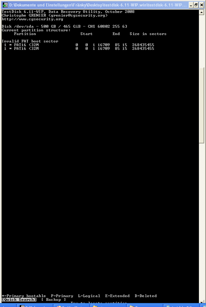 Beim Start von TestDisk wird die Platte mit 500GB angezeigt!