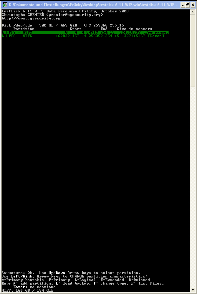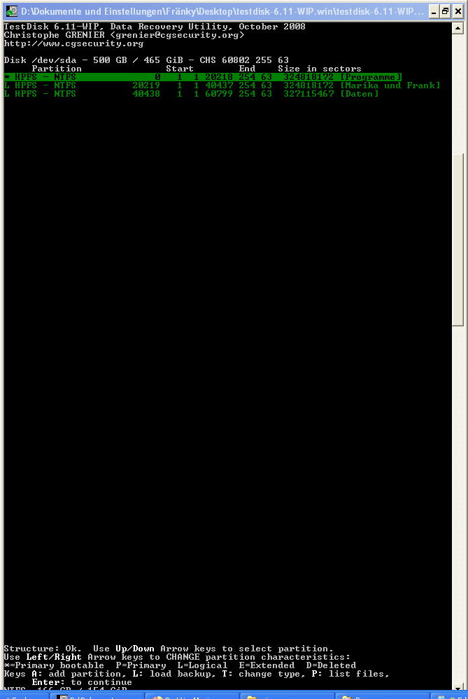 TestDisk6.11 (unter Windows) findet beim quickscan nur C:\ mit ca. 130GB, erst nach dem intensiev scan findet es dann auch die zweite.