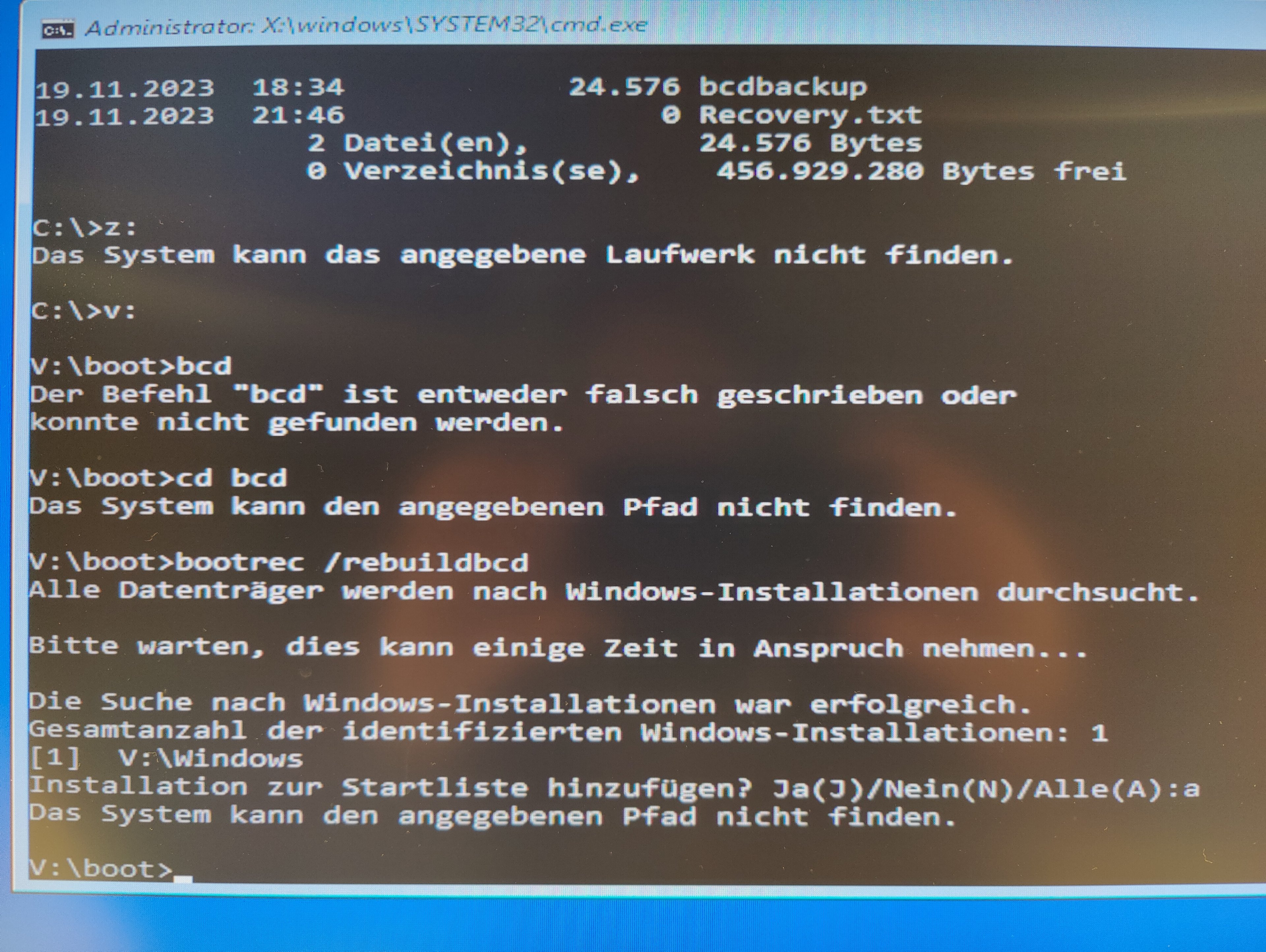 - Die Datei BCD (ohne Endung) in diesem Verzeichnis in BCD-bak umbenennen (mglw. müssen vorher Rechte von der Datei entfernt werden mit attrib BCD -s -h -r)