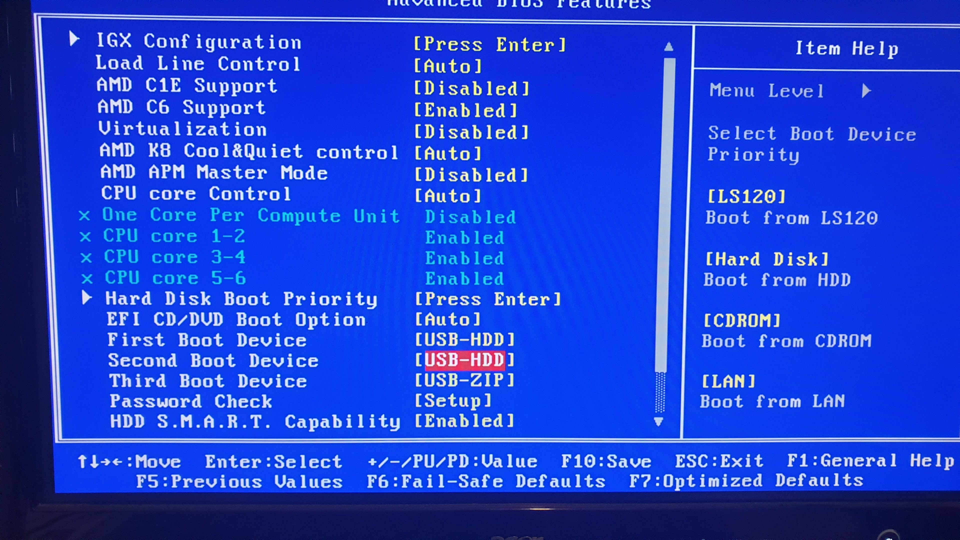 Im BIOS (ist noch so n altes, blau/weißes; AM3+ MoBo) hab ich dann als "First Boot Device" die Auswahlmöglichkeiten LS120, Hard Disk, CDROM, ZIP, USB-FDD, USB-ZIP, USB-CDROM, USB-HDD, Legacy LAN, Port: 1-HL-DT-ST und Disabled.