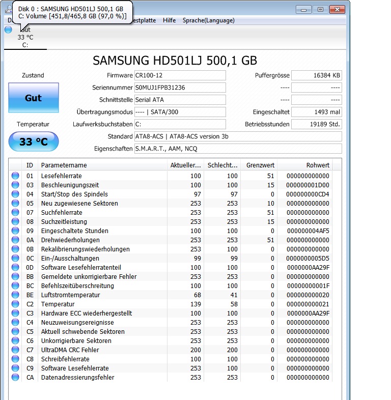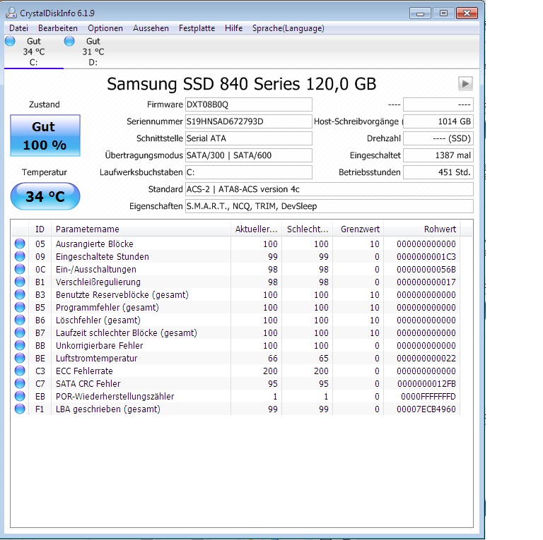 Wenn Du jetzt das SATA Kabel getauscht hast, starte CrystalDiskInfo noch mal und speichere den Screenshot ab, damit Du den später zum Vergleich hast und bemerken kannst, ob der Rohwert von C7 oder der des POR-Wiederherstellungszählers (EB) noch steigen.