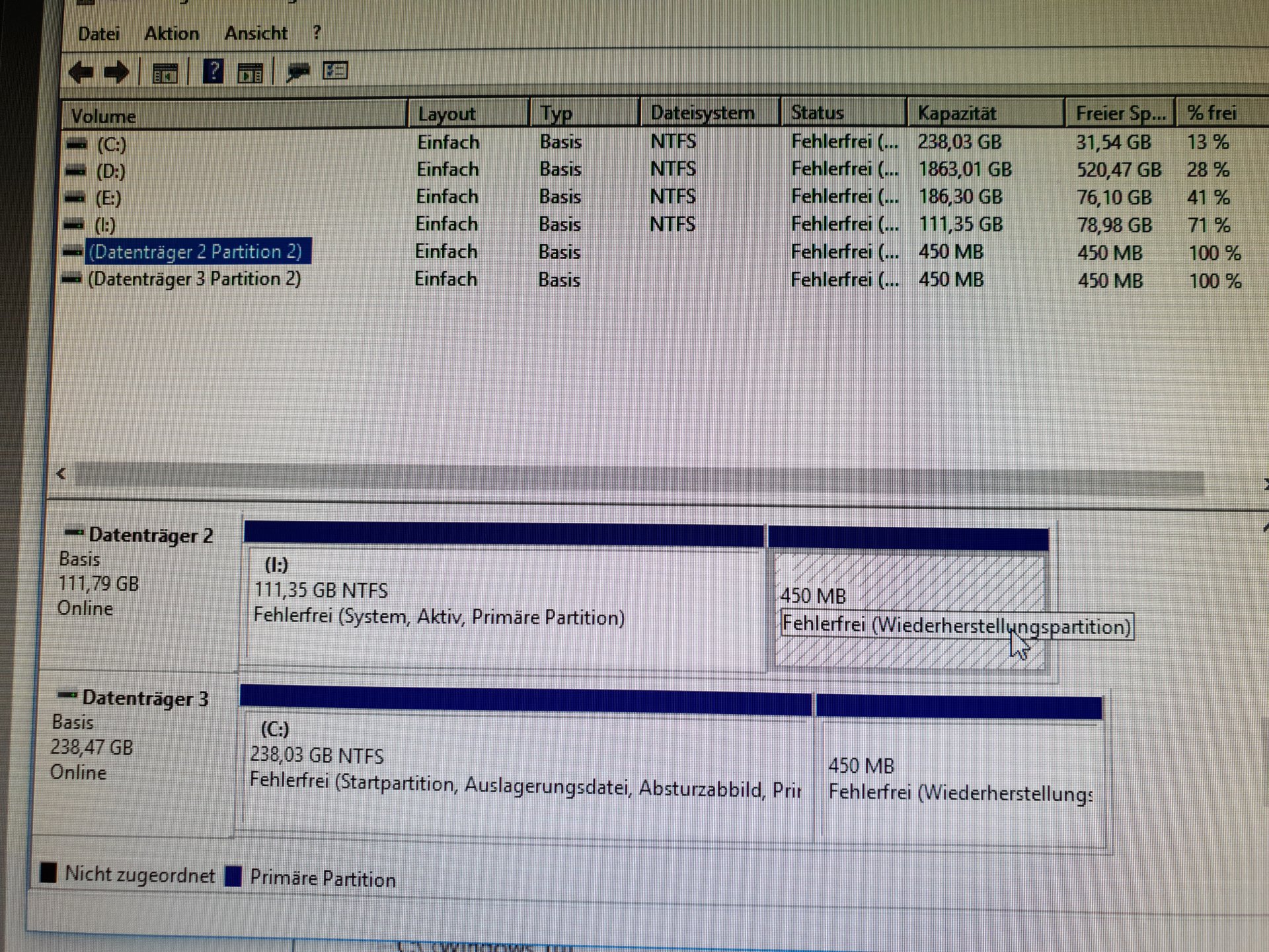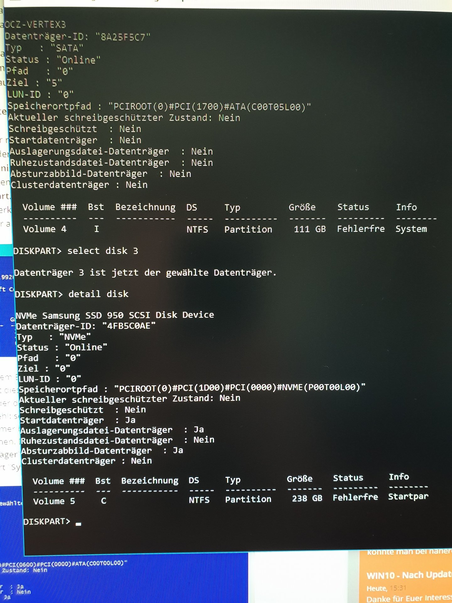 Ist schon recht vermurkst alles und bei beiden Platten zeigt er bei diskpart die zweite 450MB Sicherungspartition nicht mehr an, warum auch immer. In der Datenträgerverwaltung sehe ich sie noch. Es muss doch verflixt nochmal möglich sein den Bootmanager auf die 950 Pro zu kriegen um die Vertex 3 rauszuschmeißen. Meine alte Vertex 2 hat sich gerade verabschiedet und bei der 3 kann es auch nicht mehr lange dauern, vorher hätte ich das gerne geschafft. Bisher hab ich Windows immer wieder ans laufen bekommen, aber durch den Murks dauert es alleine bis zum Postscreen jedes Mal fast 30 Sekunden und der Start insgesamt sehr lange. Möchte alle Alten Platten raus werfen.