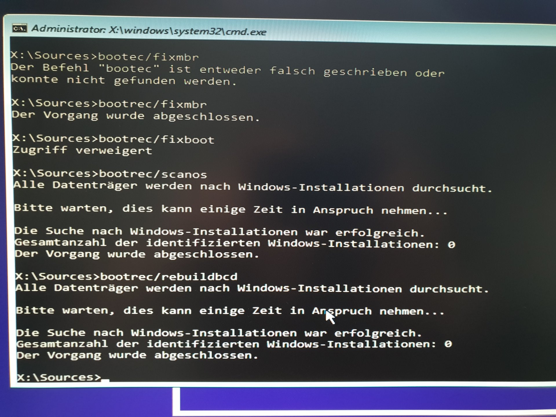 -bootrec/fixboot... schlägt IMMER fehl, entweder "Zugriff verweigert" oder "Element nicht gefunden" je nachdem wie ich bei diskpart rumgepfuscht hab.