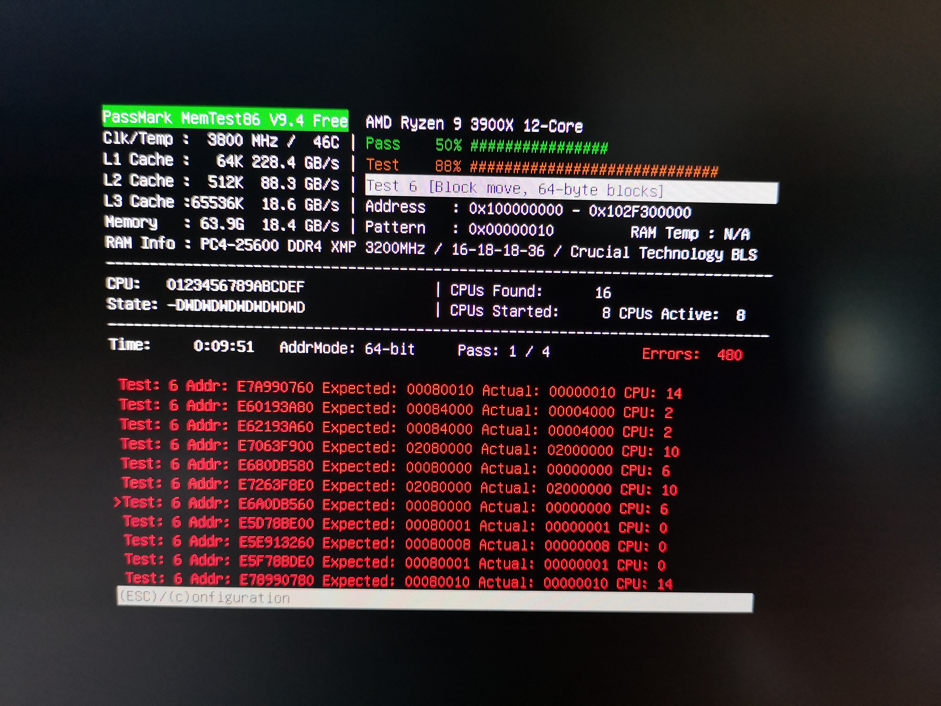 - Memcheck86 laufen lassen -> Zunächst mit allen 4 RAM Riegel mit errors (Siehe Screenshot)