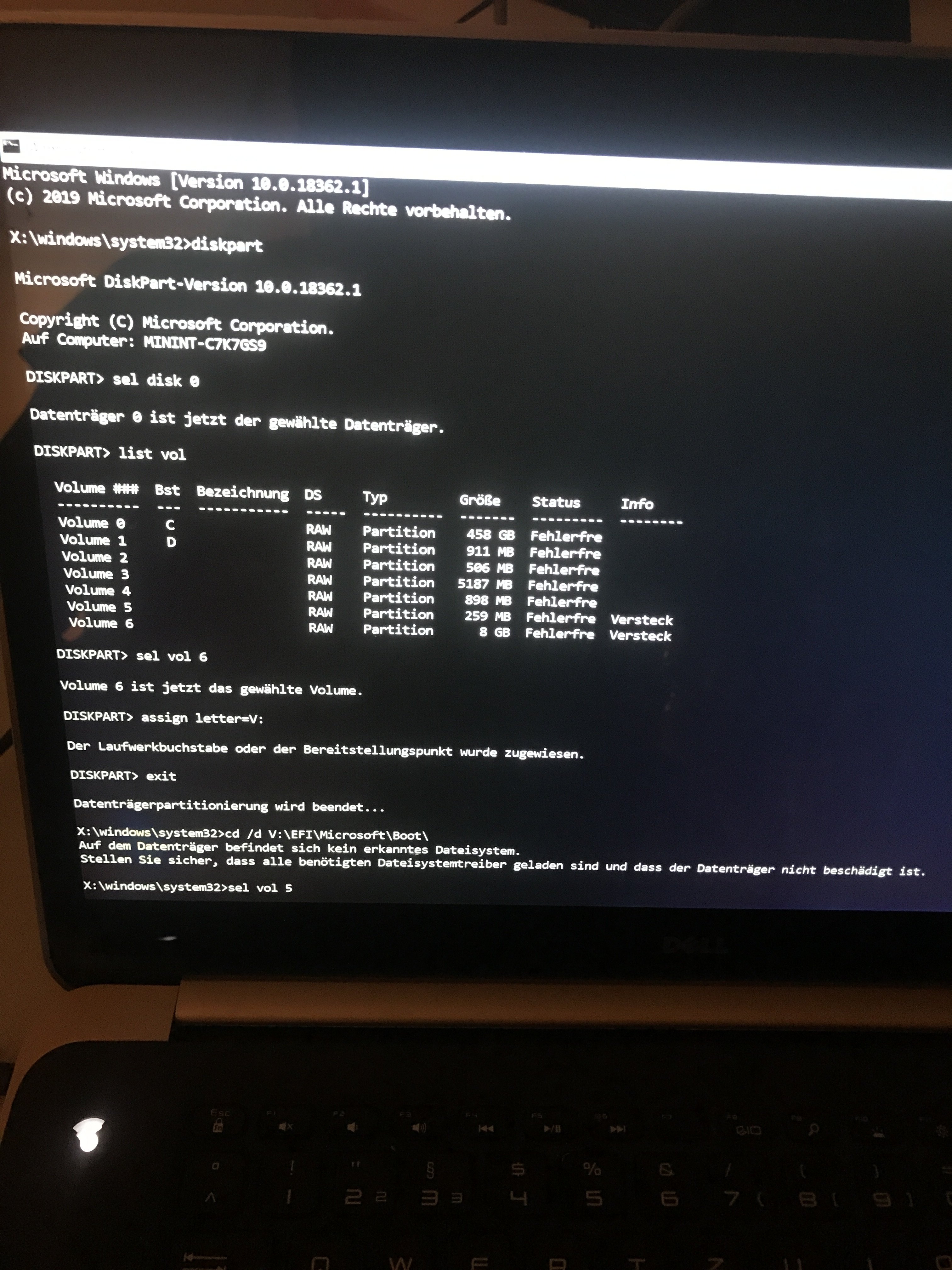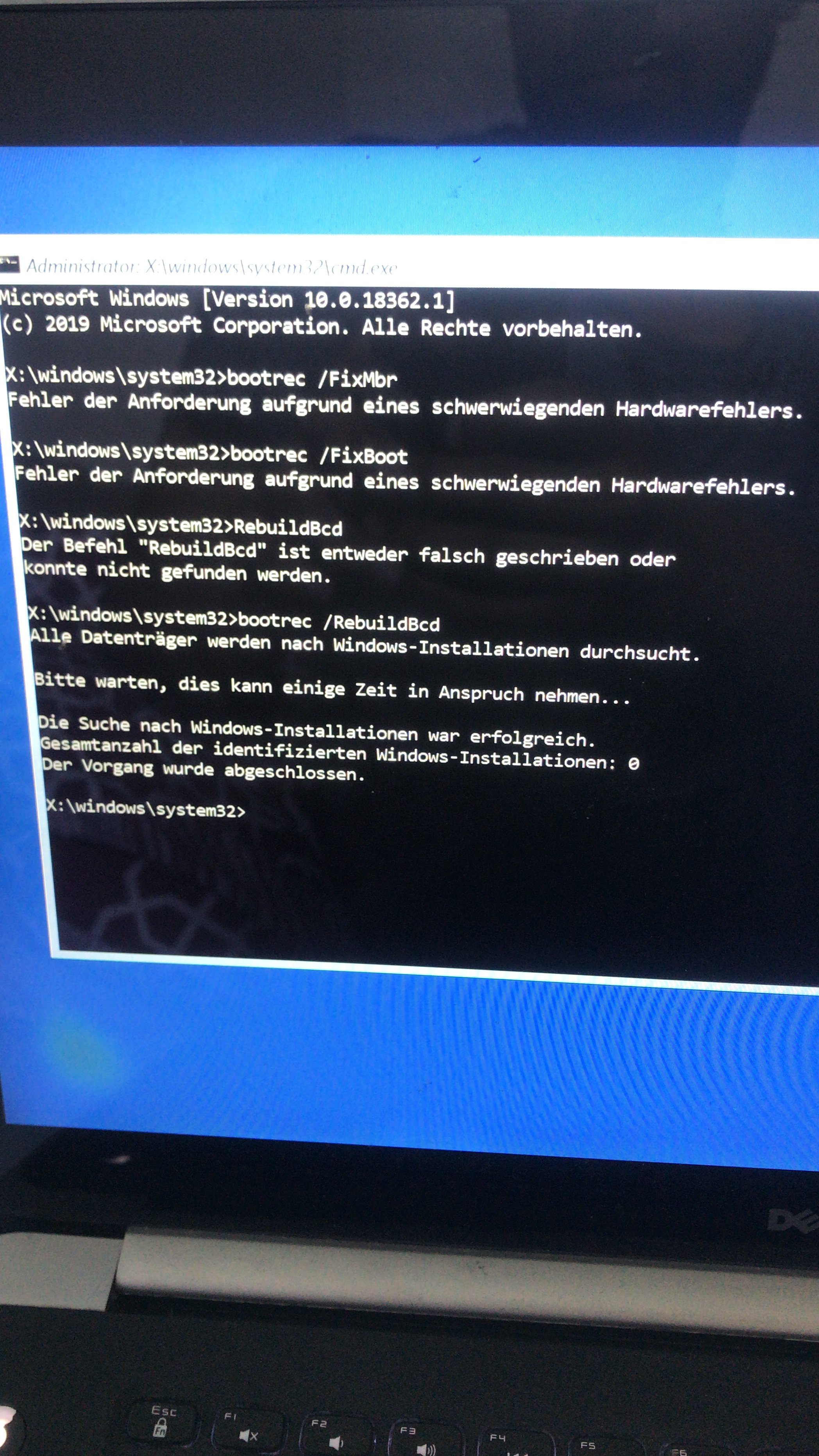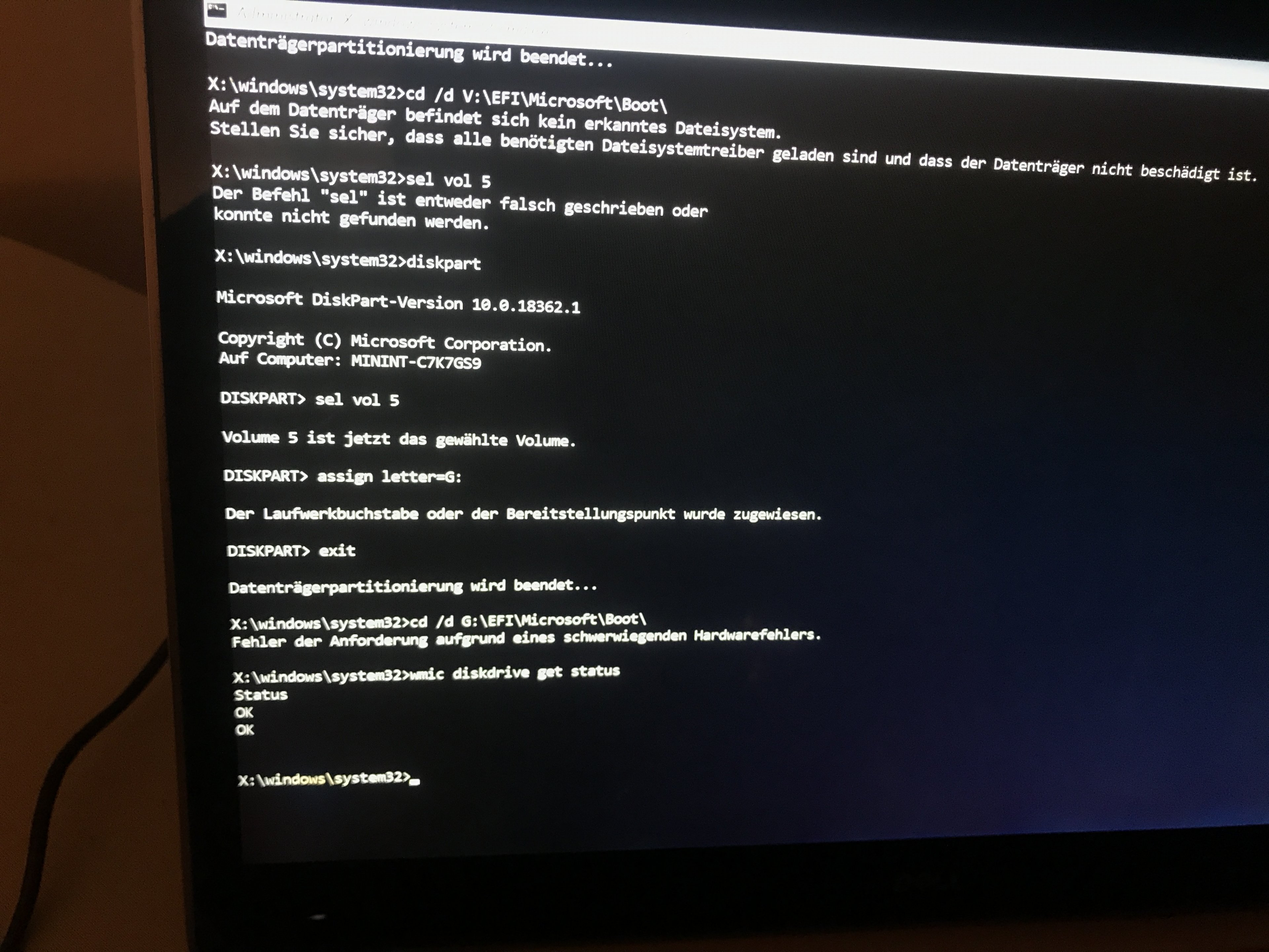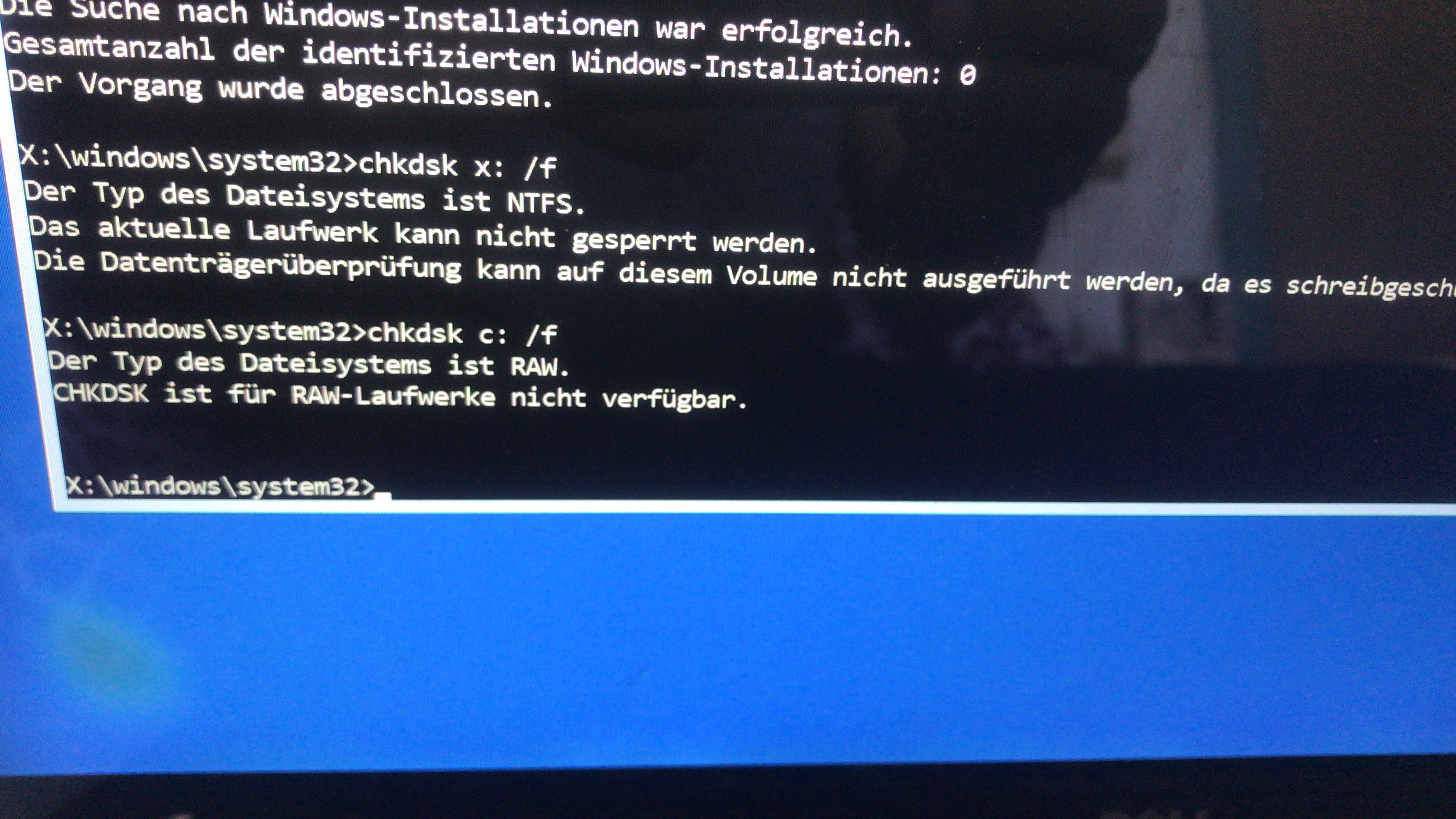Dann habe ich es via UEFI versucht und wählte den Windows Boot Manager, welcher mir weder mit Starthilfe noch mit Wiederstellung helfen konnte. Da ich auch keine Image Datei hatte zum auswählen. Über den CMD im selbigen Menü habe ich versucht über Befehle wie chkdsk den Datenträger zu prüfen, jedoch ist nur die ssd sichtbar und eine Überprüfung nicht möglich da schreibgeschützt.