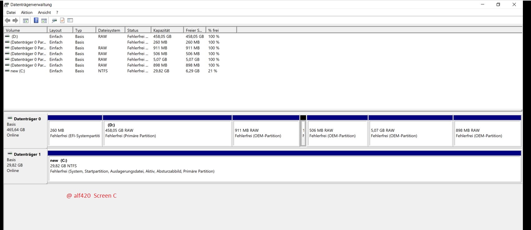 Alle Partitionen auf Datenträger 0 sind noch im RAW Format, bis auf die EFI Systempartition. Die müssen noch umkonvertiert werden. Am besten mit Diskpart und der Anleitung, die ich zuvor gepostet hatte. Das kann man während des laufenden Windows erledigen.