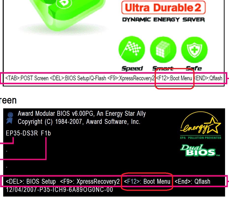Seltsam. Im Anhang ein Bild, F12 "soll" ein Bootmenü hervorrufen. Wie das Menü aussehen kann: https://www.google.de/search?q=f12+gigabyte&tbm=isch