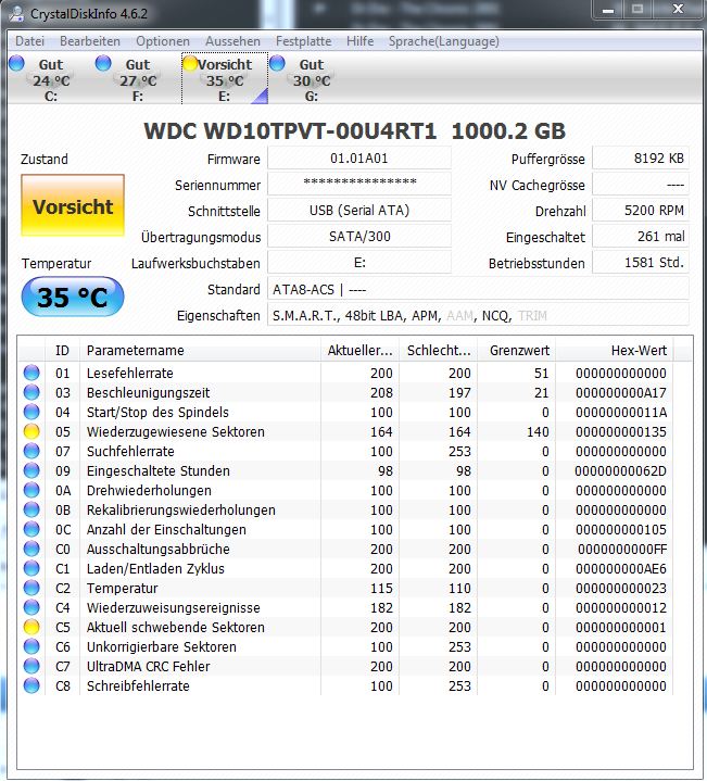 h2format sagt, dass was am bootsektor nicht stimmt und crystaldisk markiert mir 05 wiederzugewiesen sektoren und c5 aktuell schwebende sektoren gelb.