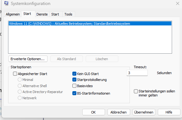 obwohl ich in der msconfig.sys "BS-Startinformationen" und "kein GUI-Start" angekreuzt habe wird der