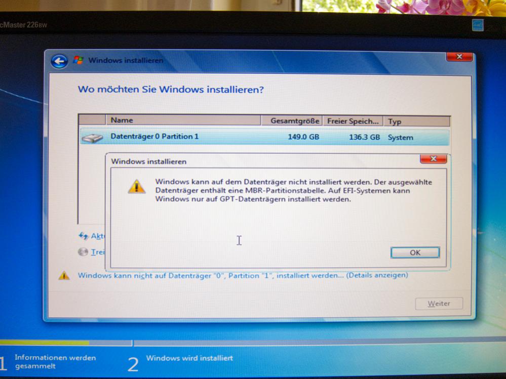 Windows kann auf dem Datenträger nicht installiert werden. Der ausgewählte Datenträger enthält eine MBR-Partitionstabelle. Auf EFI-Systemen kann Windows nur auf GPT-Datenträgern installiert werden.