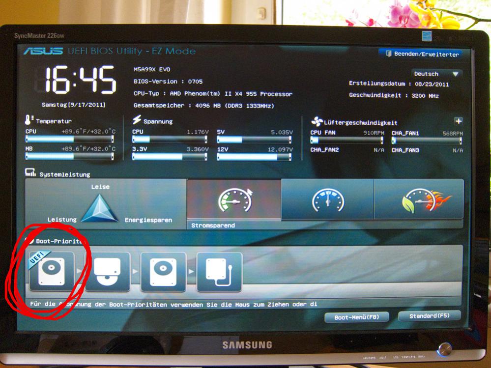 Diese EFI-Patition kann man mit der Windows-Installations-DVD erstellen. Zuerst muss die CD in den Rechner, dann das Bios starten. Dort kann man ja die Bootpriorität im Startbildschirm einstellen, an erste Stelle muss das Symbol mit der Bezeichnung UEFI (erstes Bild). Dann natürlich F10 und speichern. Wenn man nun aber nach einem Neustart Windows von CD installieren will, sagt der PC: