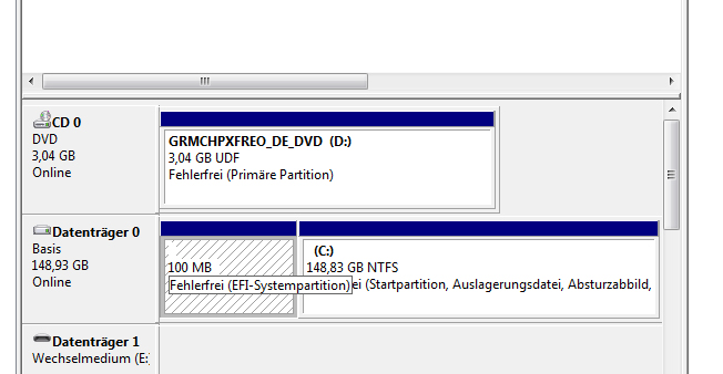 Wie Du siehst, fehlt auch bei mir die EFI-Systempartition. Es ist wirklich nur Win 7 auf der SSD. Die Aufteilung des Laufwerkes müsste aber so aussehen, wie hier (erste Abbildung von oben)=http://technet.microsoft.com/de-de/library/dd744301%28WS.10%29.aspx