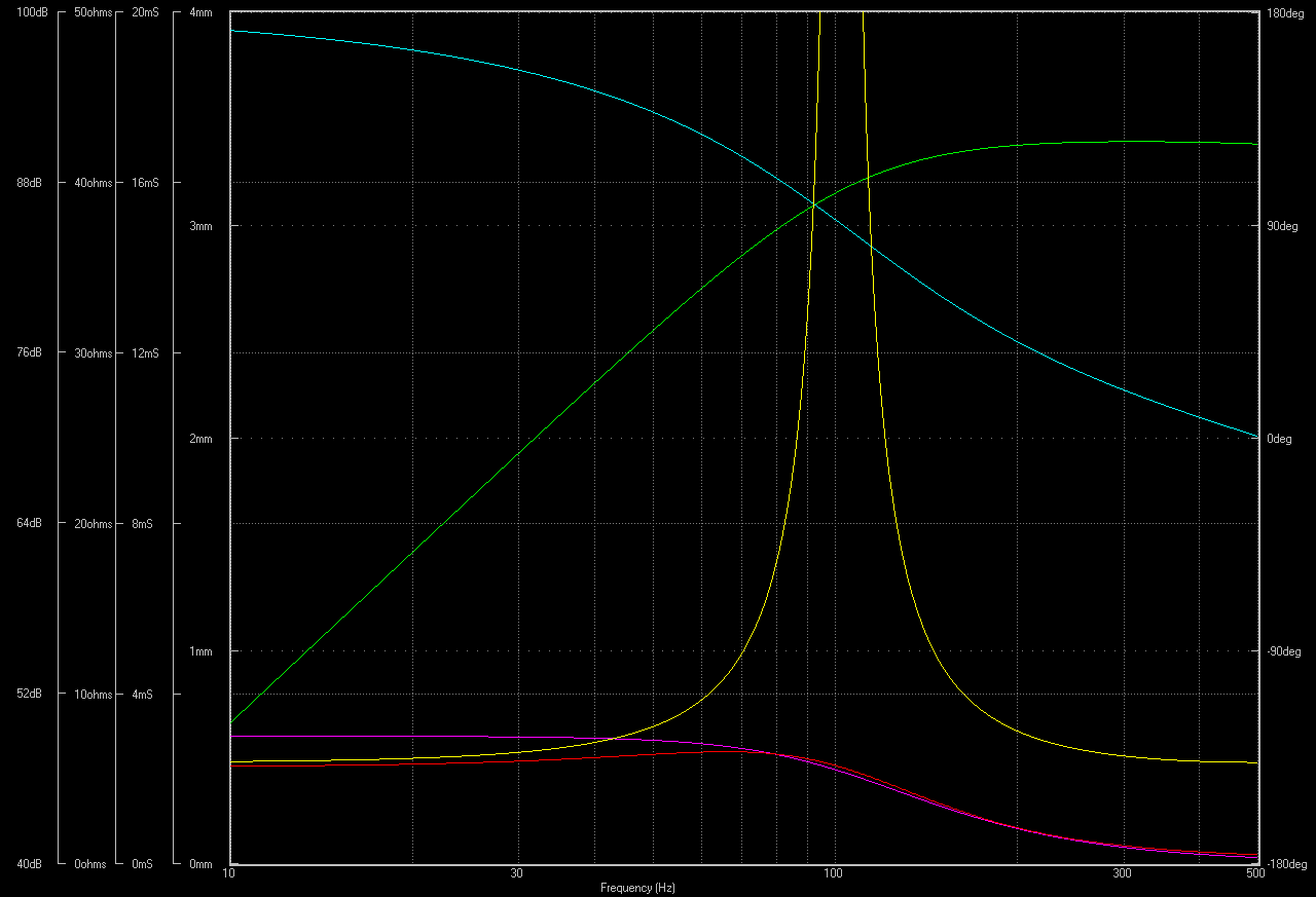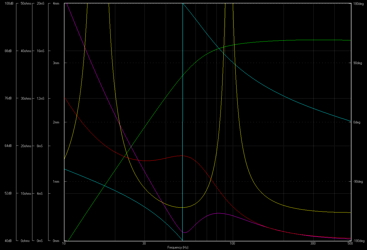 An der grünen Kurve sieht man sehr schön, wie der Schalldruck im Bassreflexgehäuse stärker abfällt und gleichzeitig die Membranauslenkung sehr hoch wird.