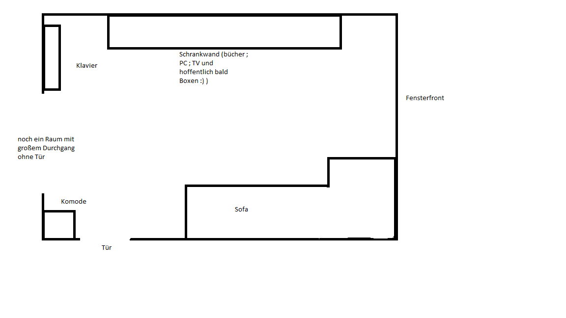 Zimmer ist nicht voll gestellt (nur Schrankwand Sofa und 2 Regale + Klavier(alles an der Wand)) und ca. 5m x5m meter groß.