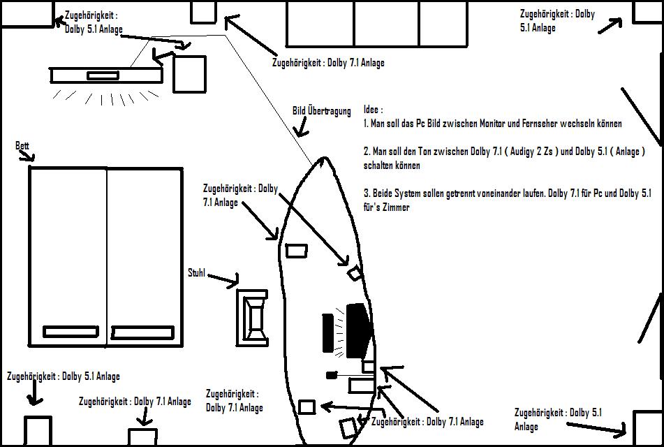 Hallo. Ich habe nun mal was gezeichnet so wie ichs mir vorstelle wegen der Boxenverteilung in meinem Zimmer. Das kann man im nachhinein ja noch ändern.
