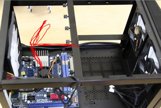 Der Radiator inkl. Lüfter soll wenn möglich 120x120mm sein und an der Lüftervorrichtung an der Rückseite des Gehäuses zu befestigen sein (siehe professionell markierte Stelle im Bild).