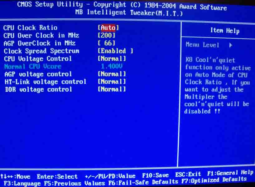 Am besten erhöhst Du den Vcore erstmal auf 1,5 Volt, damit spart man sich beim ersten Versuch eventuell nen CMOS-Reset. Wenn es läuft, kannst Du ja den Vcore wieder auf 1,45 und dann auf 1,4 Volt stellen. usw. usw.....