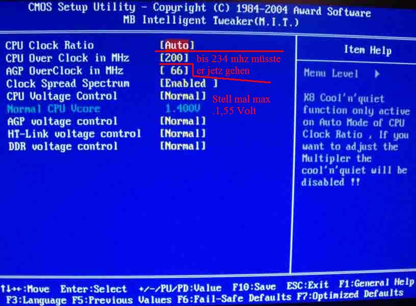 Ach ja: den Vcore erhöht man bei Dir unter "CPU Voltage Control". Entweder steht dann da 1,4 Volt dann machst Du es auf 1,5 oder Du musst um 0,1 Volt erhöhen. Ist bei jedem Bios anders...