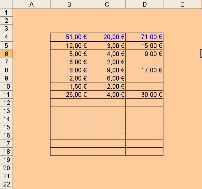 in B4 und C4 sollen die gesuchten Summenformeln herein. In B4 sollte auch nur B5, B6, B8 und B11 addiert. wenn man von den genannten Zellen zwei Spalten nach rechts geht steht in D5, D6, D8 und D11 etwas drinnen.