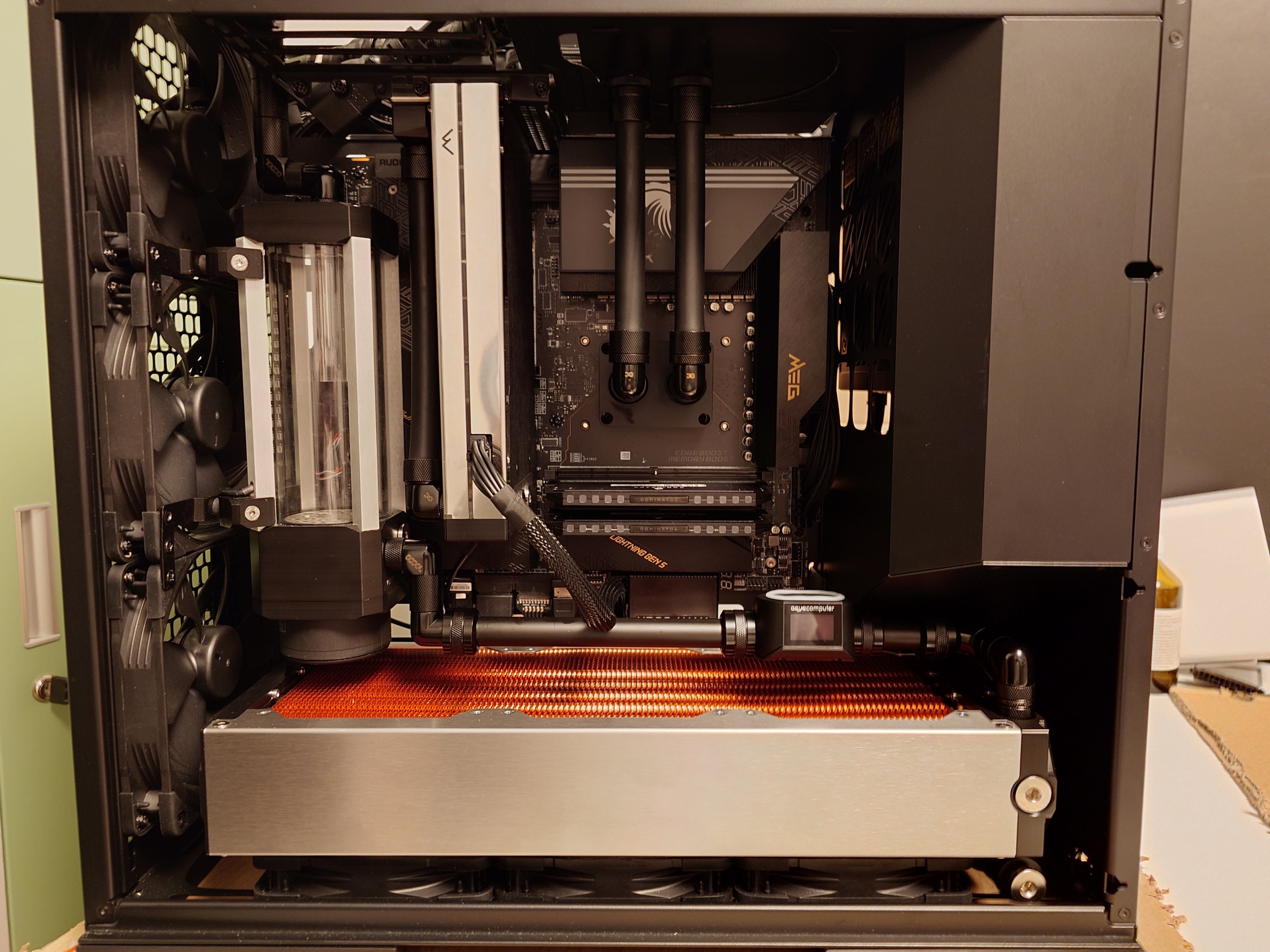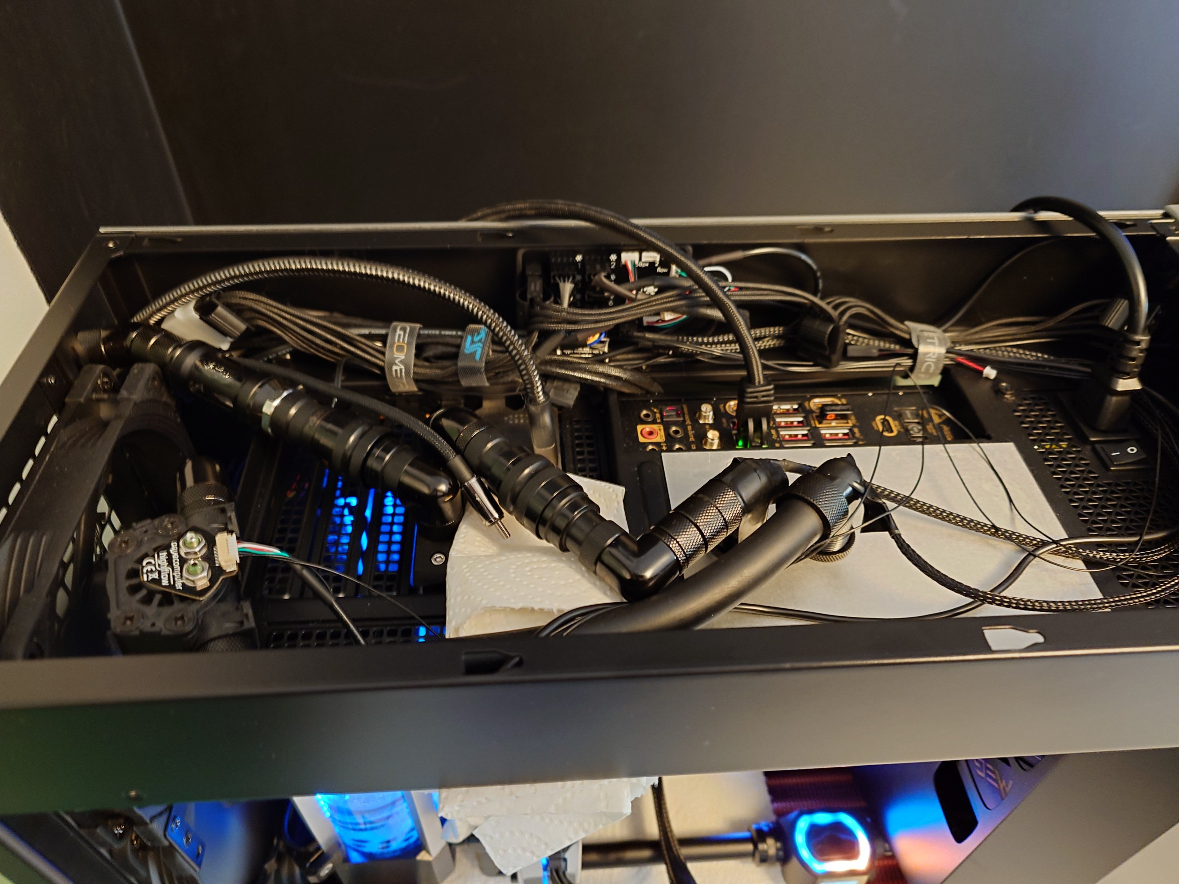 Habe mir eine neue Wasserkühlung zusammen gestellt. Neben CPU/GPU Block habe ich eine ziemlich verwinkelte Schlauch-/Rohrführung mit einigen Schnellkupplungen verbaut. Und - zumindest im Hinblick auf die Schnellkupplungen wurde es hier bereits vorhergesagt - die Pumpenleistung ist mau.