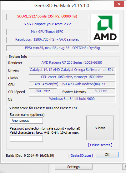 so der erste benchmark - cabini athlon läuft flüssig auf 2,501 Ghz ohne nennenswerte temps ( man ich wundere mich noch immer das diese kleine mini APU dermaßen leistungstark bei einer TDP von 25 watt ist