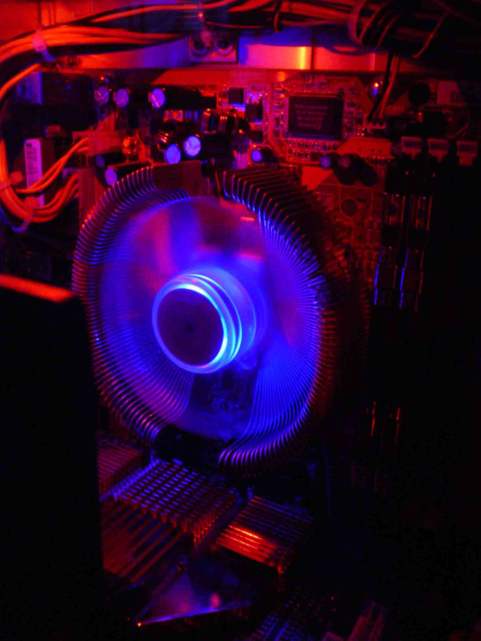 naja, ich habe alles blau und rot, blauer CPU Kühler und der eine 120mm Lüfter, und dann habe ich noch rote LED's. Das sieht hammer aus, da sich das blau mit dem rot vermischt.