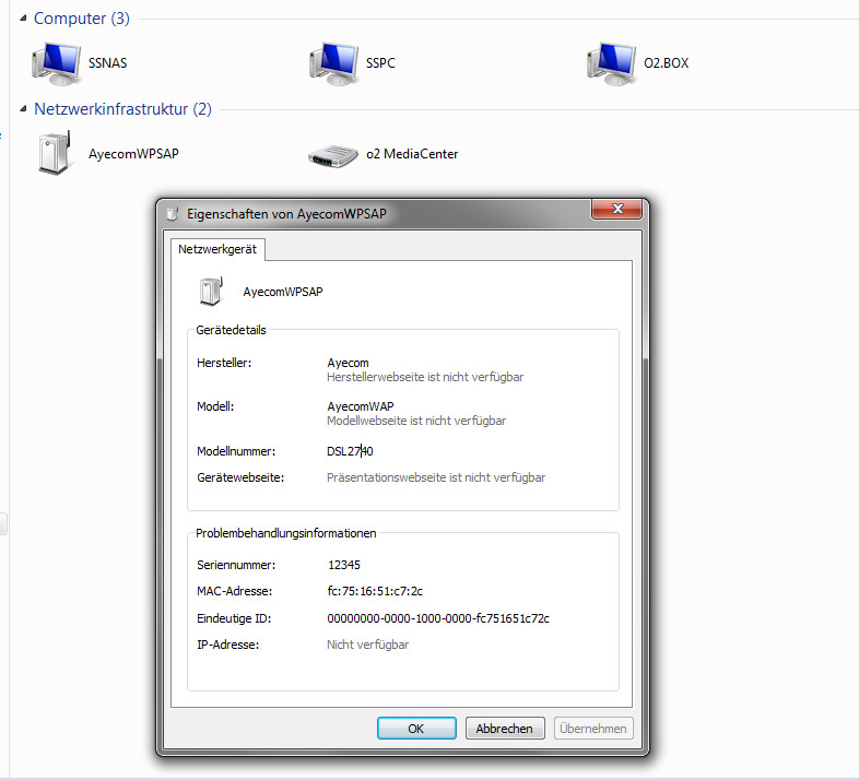 Liebes Forum. Seit einiger Zeit taucht bei mit im Netzwerk, genau gesagt unter Windows unter Netzwerke, ein mir unbekanntes Gerät. Mein Netzwerk ist relativ einfach aufgebaut. Ein o2 Router, eine NAS und ein Notebook, welches manchmal über WLAN und manchmal über Netzwerkkabel verbunden wird. In Beiden Fällen taucht das Gerät auf. Bluetooth ist ausgeschaltet. Im Router sind keine weiteren Geräte im Netzwerk aufgelistet. Kennt jemand das Problem vielleicht?