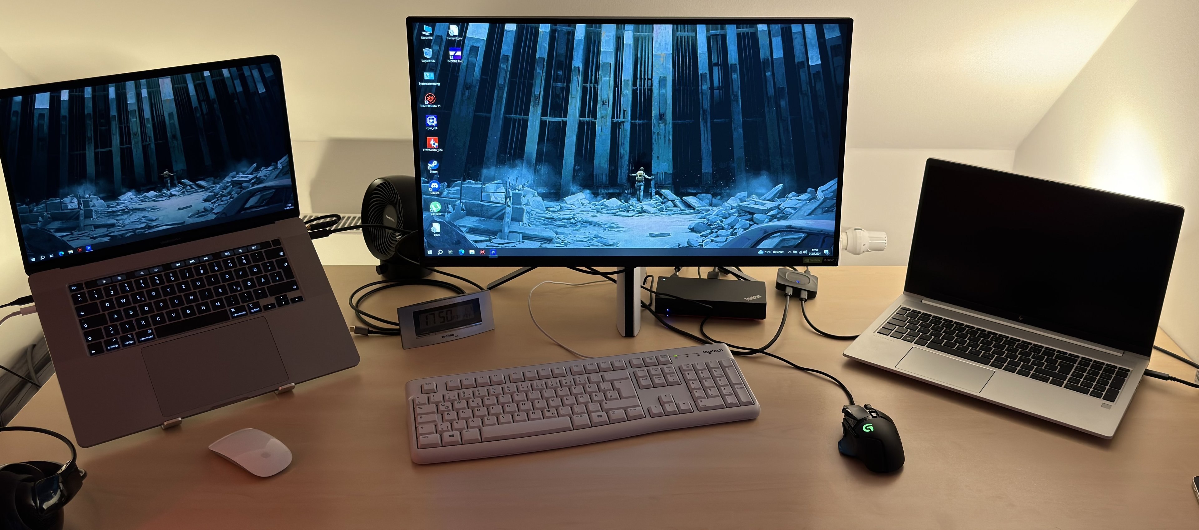 Ich nutze ein MacBook Pro 16 mit Thunderbolt 3 und ein normalen HP Laptop und möchte diese an nur einem Monitor betreiben. Momentan gehen beide zu einen einfachen USB C Switch und von dort zu einer dockingstation wo Monitor per DisplayPort und Peripheriegerät angeschlossen sind. Soweit alles gut, doch leider unterstützt der ganze Aufbau kein Thunderbolt 3/4 und somit kann ich vom MacBook zu meinen 10bit Monitor nur mit 2x2 Lanes also etwa nur 8gbit Bildsignal. Das macht mir Probleme mit der möglichen farbtiefe und Hz. Ich benötige jetzt eigentlich nur einen Thunderbolt 3/4 Switch und eine Thunderbolt fähige dockingsstation oder gleich einen Thunderbolt kvm Switch.