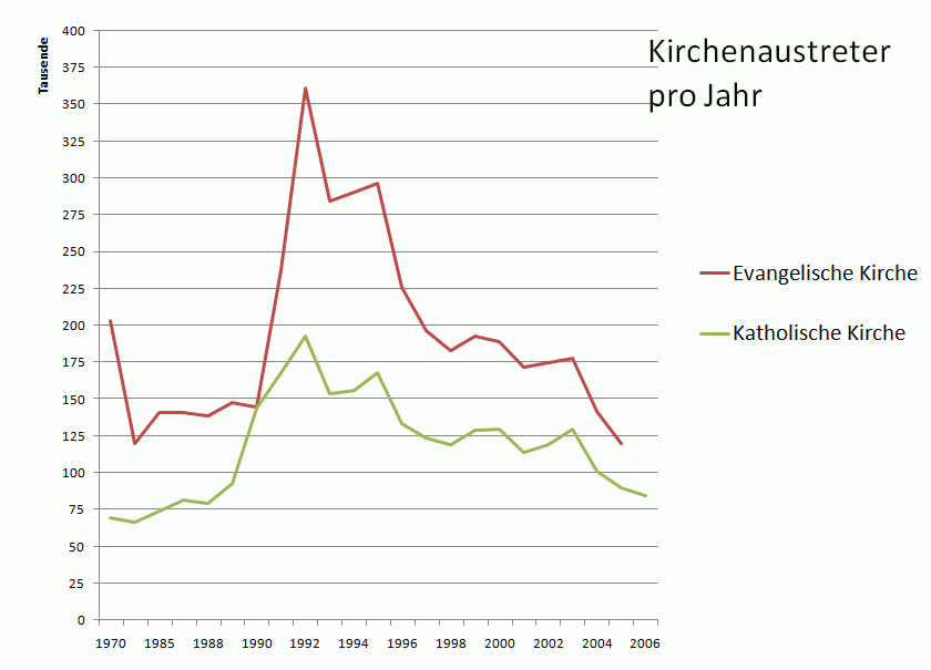 Aufgrund dieser Daten habe ich hier mal ein kleines Diagramm gemacht, wieviele Leute pro Jahr austreten (nur neuere Zahlen). Die Zahl der Menschen die pro Jahr eintreten ist meistens nur vierstellig.