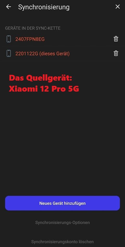 Ich habe ein Xiaomi 12 Pro 5G, welches das GerÀt ist, wo von die Brave Browser-Synchronisation aus starten soll und ich habe ein Xiaomi 14T Pro, welches das GerÀt ist, wo die Daten vom Xiaomi 12 Pro 5G ankommen und im dortigen Brave Browser eingepflegt werden sollen. Auf beiden GerÀten ist in der jeweiligen Brave Browser-App schon die Synchronisation in soweit angelegt, dass in beiden Apps unter Synchronisation die Sync-Kette bereits angelegt ist (siehe Screenshots).