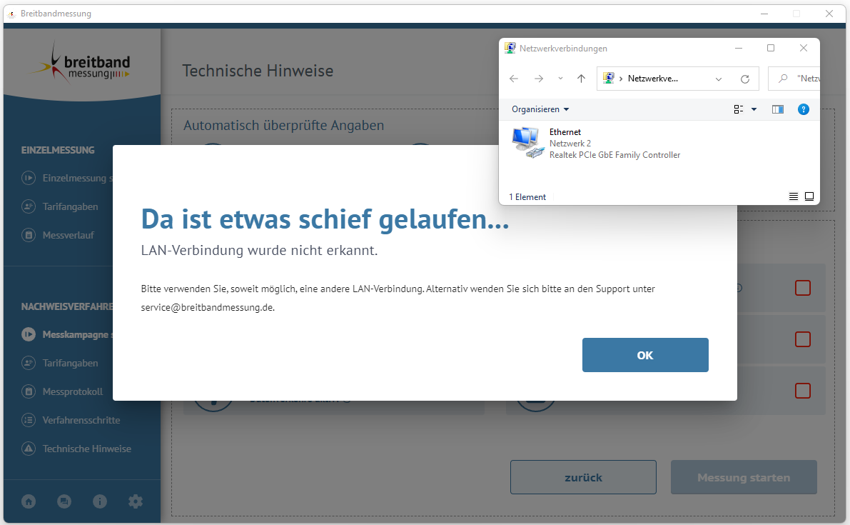 Die App will aber vor Beginn der eigentlichen Messung erstmal prüfen, ob das Netzwerkinterface überhaupt die nötige Geschwindigkeit liefern kann. Also wenn man einen 1Gbit/s Tarif in der App ausgewählt hat und die Netzwerkkarte nur im 100Mbit/s Modus läuft (oder gar keine 1Gbit/s Netzwerkkarte ist), verweigert die App die Messungen. Nur dazu muss ja erstmal das Interface erkannt werden, um dessen Parameter auszulesen.Luthredon schrieb:Was heißt, die Ethernet Verbindung deines PCs zum Router wird nicht erkannt? Das muss auch nicht, die Verbindung findet auf 'höherer Ebene' statt.