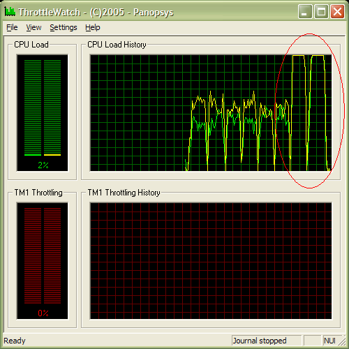 Du musst die zwei Graphen addieren, die dort angezeigt werden, weil du zwei Prozessorkerne hast. D.h. in Wirklichkeit ist es natürlich nur einer aber mit HT-Technologie. Der gaukelt deinem System zwei Kerne vor.