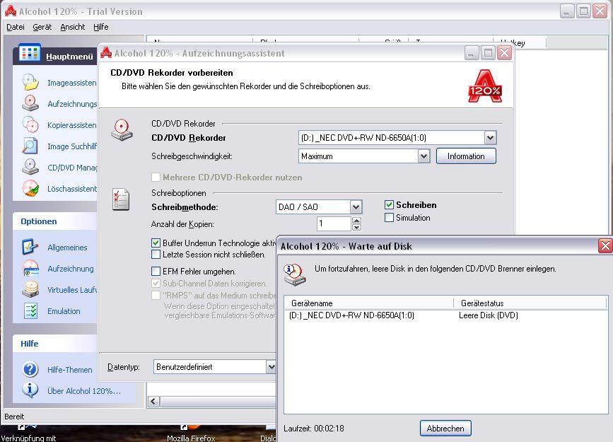 Bei DVD-Brennversuch mit Alcohol 120% 7.0 auf WinXP-Home geht ab diesem Fenster nichts mehr: