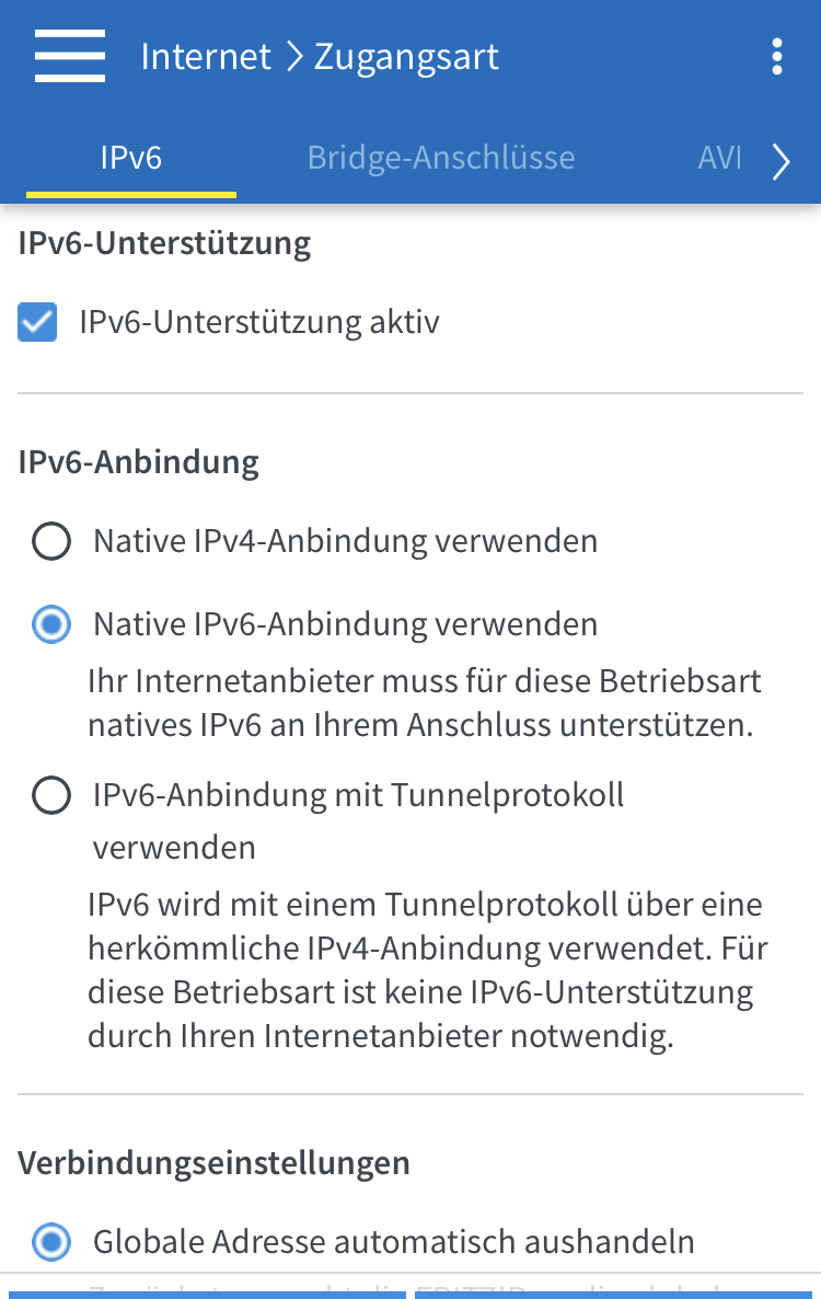 Was mich jetzt interessieren würde im Bridge Mode kriegt man da nur eine ipv4 oder auch eine ipv6 oder muss man da extra etwas einstellen? Beim zweiten Router steht ipv6 nicht verfügbar. Bei weistmeineip.de sagt es Dual Stack verfügbar ipv6 nicht.