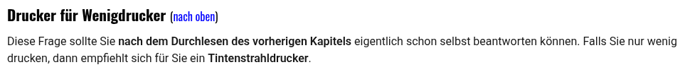 Sorry, aber die Seite kann ich nicht ganz ernst nehmen. Die empfehlen einen Tintenstrahldrucker wenn man wenig druckt. Meine Erfahrung mit solchen Geräten hat aber gezeigt, dass fast jedes nach zwei Monaten Standzeit eingetrocknete Patronen hat und ich neue kaufen musste.