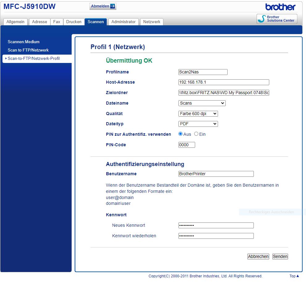 Ich nutze einen Brother MFC-J5910DW, der SMB und FTP Scan kann. Nun wollte ich diesen so einrichten, dass dieser auf die Festplatte an meiner Fritzbox Scannt, welche auch als FritzNas genutzt wird.