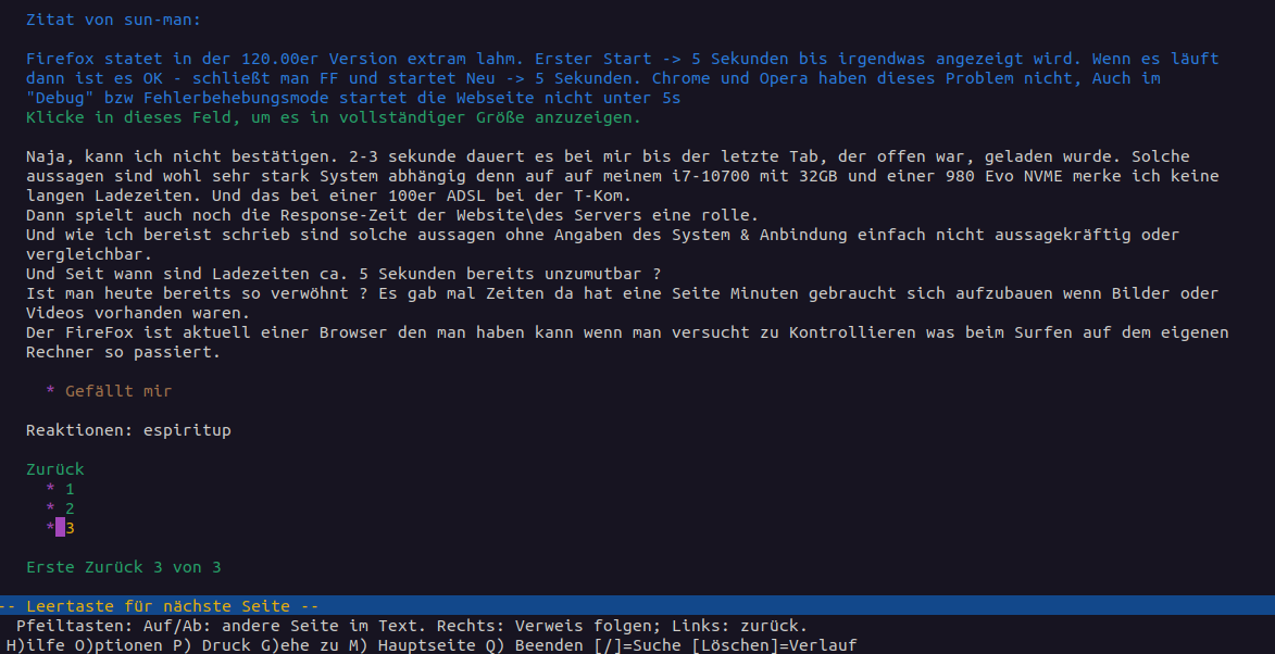 Der Erstaufruf des Firefox dauert eben 5s und diese sind einfach ein leeres Bild. Ob das nun ohne Webseite, mit Google, Golem oder Computerbase ist? Ist in dem Fall irrelevant. Ich kann im Zweifelsfall sogar alle Responszeiten auslesen oder ich fahr in ein RZ direkt am DE-CIX. Um mir auch mal auf die Brust zu trommeln....ich weiß durchaus wovon ich reden wenn ich in dem Fall meckere. Zudem sollten DANN ja Browser wie Opera, Chrome, Edge oder Brave oder Android ebenso lange laden.....oder eben ein Textbrowser.