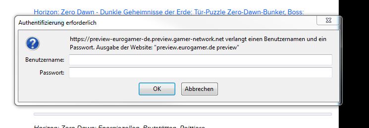 auf der Seite Eurogamer angucken wollte kam nach dem anklicken auf einmal ein Fenster, wo man ein Passwort und einen Benutzernamen eingeben sollte. Dort stand, dass eine Seite namens preview-eurogamer-de. preview.gamer-network.de dies verlangt.