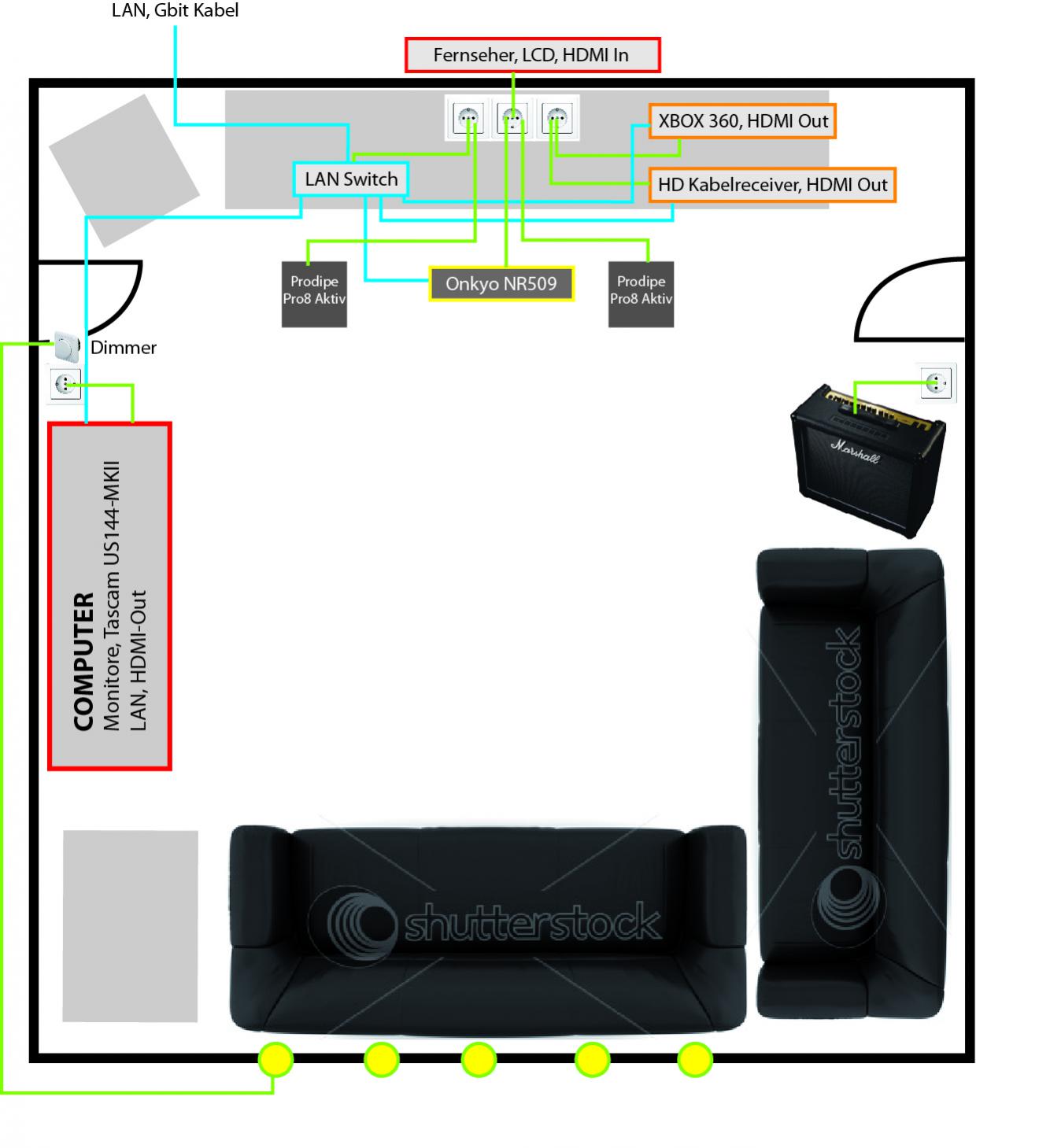 Anbei eine Skizze meines Raumes samt Verkabelung. Bitte anschauen, danach weiterlesen